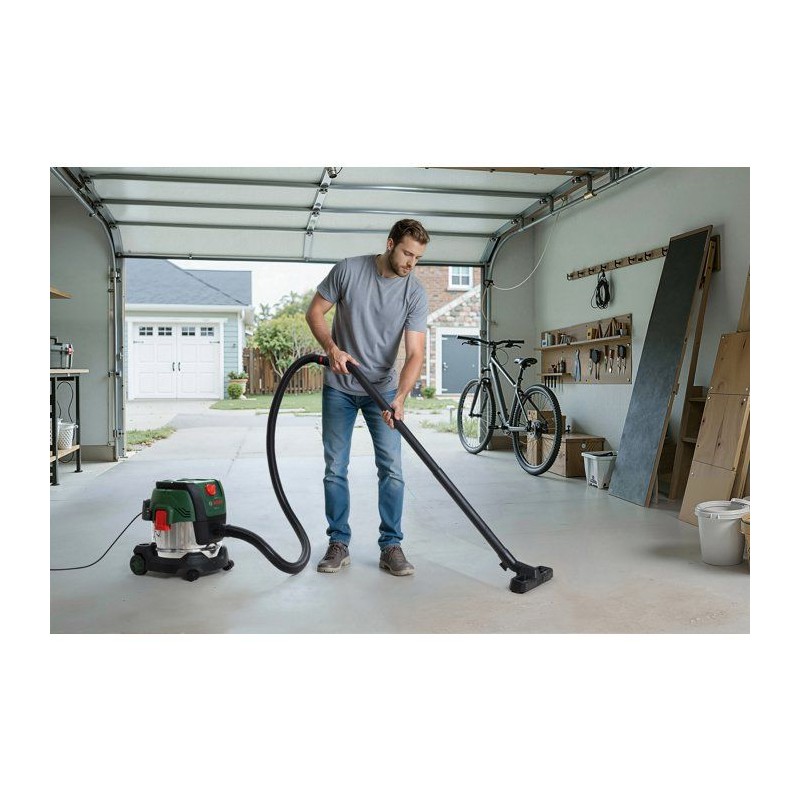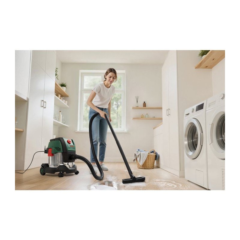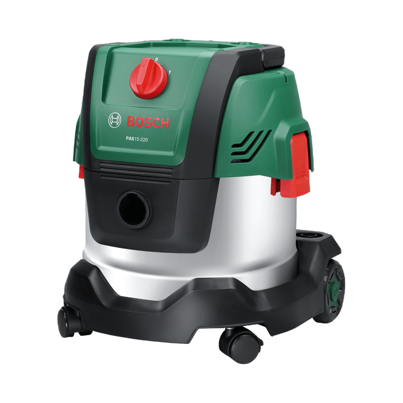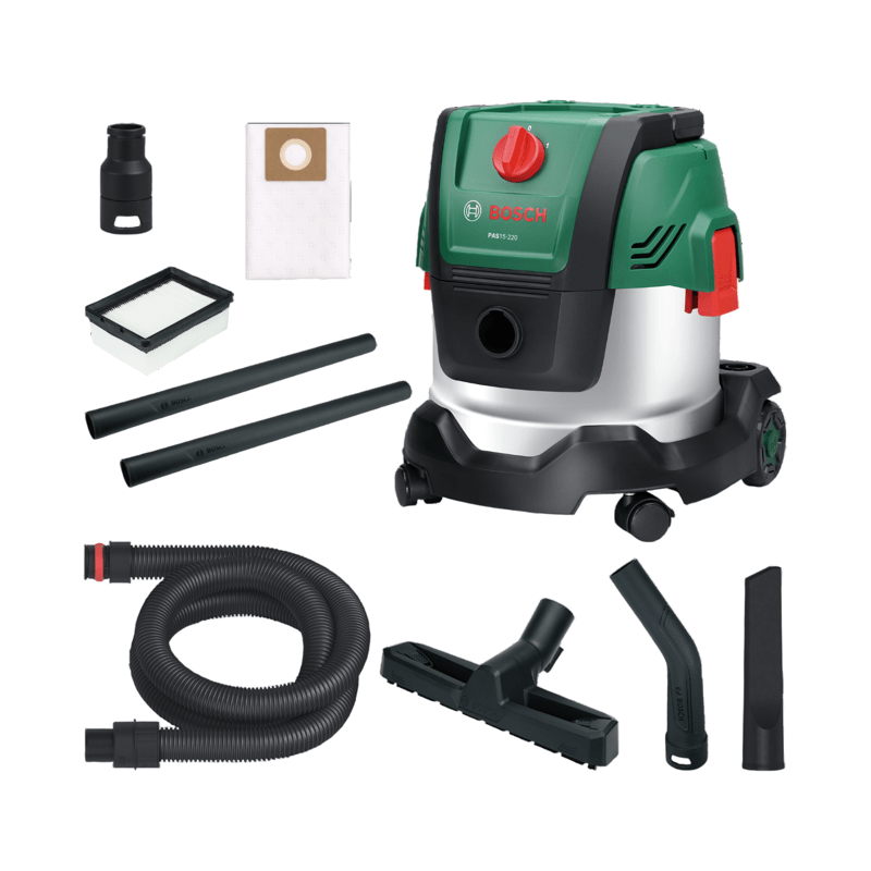 Cet aspirateur puissant enleve sans effort les saletés seches et humides grâce a son moteur de 1200 W et a sa puissance d'aspiration de 220 mbar. Il est fourni avec un adaptateur universel permettant de le raccorder a de nombreux outils électroportatifs d'aspiration directe des poussieres. De plus, le filtre plissé plat gere aussi bien l'aspiration de matieres seches que de liquides. Le PAS15-220 se déplace facilement sans rien perdre de sa stabilité grâce a son conteneur en acier inoxydable de 15 l, son robuste pare-chocs et ses roues anti-basculement. Cet aspirateur tres pratique dispose aussi d'une fonction soufflerie permettant d'enlever les saletés dans les endroits difficiles d'acces et de souffler les feuilles. Il comprend une large gamme d'accessoires pour toutes les tâches de nettoyage liées au bricolage.
