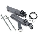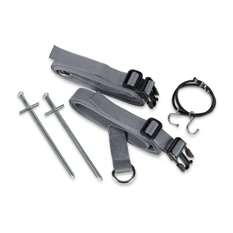 Sangles robustes parfaites en cas de vents forts. Fournies par paires. Fixation par pince pour faciliter l'installation. Sangles solides. Piquets fournis. Contenu de la livraison : 2 sangles, 2 élastiques pour la tension, 2 piquets Tarzan