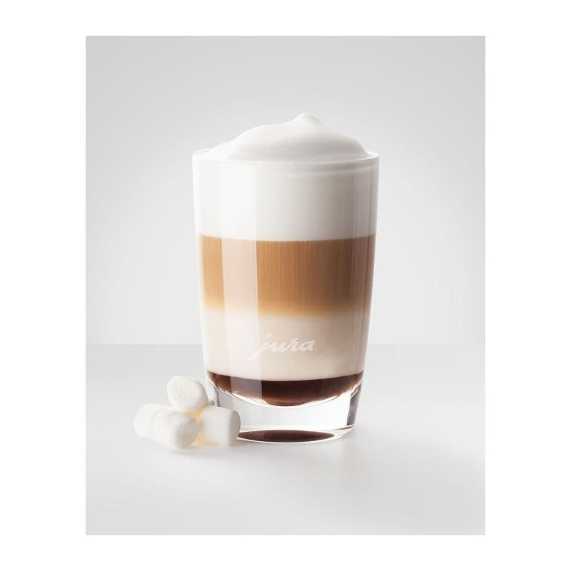 Verre a latte macchiato Les verres a latte macchiato ronds de JURA sont en cristal de plomb haute qualité. Avec leur fond légerement arrondi, ils se marient a merveille avec la sous-tasse JURA. Ces élégants verres a café étincelants sont idéaux pour présenter les trois couches d'un latte macchiato parfait. Plaisir garanti ! Contenance 220 ml environ, hauteur 10,5 cm environ, adapté a toutes les machines automatiques a spécialités de café JURA.