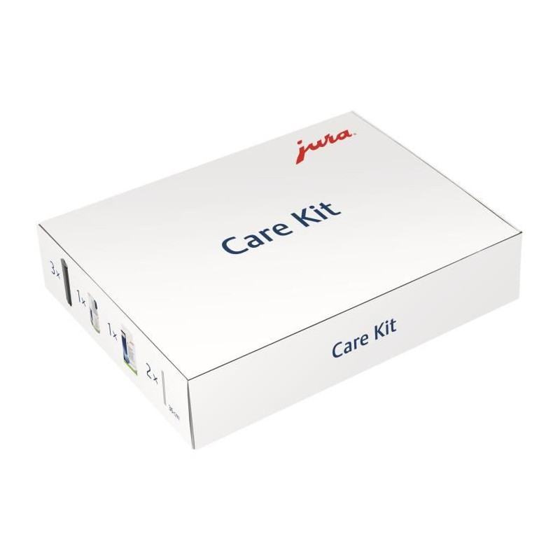 Pour le bien-etre de votre machine a café. L'entretien de la machine ainsi que l'hygiene en matiere de lait et d'eau sont des éléments décisifs pour garantir en permanence une qualité de café du plus haut niveau. C'est pourquoi il est essentiel d'assurer un entretien correct. Il prolonge la durée de vie de votre machine automatique a café et la préserve. Les produits d'entretien inclus dans ce kit vous permettront d'entretenir et de nettoyer votre machine pendant plusieurs mois. Vous pourrez ainsi profiter de cafés, d'espressi, de cappuccini, de latte macchiati ou d'autres spécialités de café d'une qualité toujours optimale. Le Care Kit contient tous les produits d'entretien importants. Il se compose de 3 cartouches filtrantes CLARIS Smart+, 6 pastilles de nettoyage, 1 détergent pour systeme de lait (mini tabs) et 2 tuyaux de lait. Avec le nouveau Care Kit, vous économisez de l'argent mais aussi de la place : grâce a sa forme pratique, la Care Kit Box se range dans n'importe quel placard de votre cuisine.