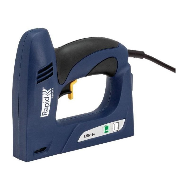 RAPID Agrafeuse électrique ESN114 pour agrafes N°140 (6-14 mm) et clous N°8 (15 mm). Agrafeuse électrique puissante et tres maniable pour les travaux autour de la maison. Efficace pour le carton, les bâches en plastique ou le papier, nécessitant une fixation sécurisée.