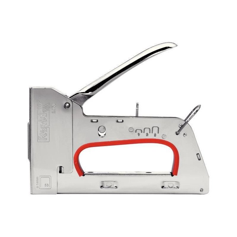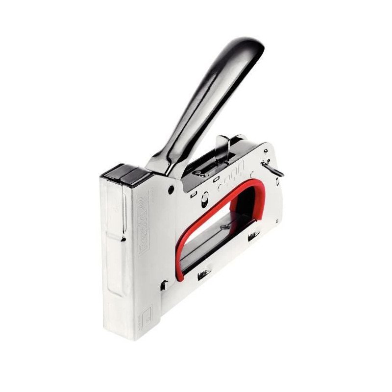 Agrafeuse métallique de haute résistance répondant aux exigences des professionnels. Convient pour les tissus lourds, toile, cuir, papier, etc. Nouveau! Réglage de puissance 3 positions breveté, développé avec une physiothérapeute, pour soulager les muscles de l'avant bras. Réduit jusqu'a 40% votre effort pour les travaux requierant des agrafes de longueur moyenne. Parfaite pour les utilisations journalieres et intensives.