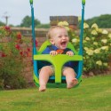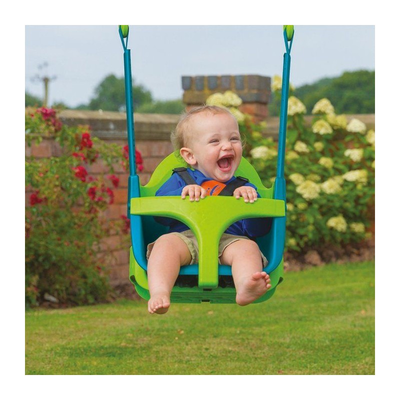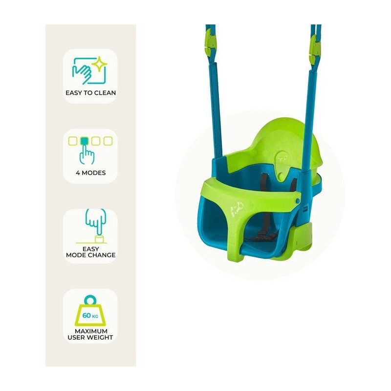 Balançoire pour bébé qui grandit avec l'enfant, 4 modes pour 4 âges : - Mode 1 : une balançoire de style « cocon » offrant un soutien total avec appui-tete moulé, barre en T et harnais. La balançoire est spacieuse et il est facile d'y installer et d'en extraire le bébé (6 mois et plus). - Mode 2 : une fois votre enfant pret, vous pouvez retirer l'appui-tete pour créer une balançoire baquet, toujours parfaitement sécurisé grâce a la barre en T et au harnais (12 mois et plus) - Mode 3 : la barre en T est retirée pour ne garder qu'une balançoire baquet avec harnais qui sécurise parfaitement votre enfant pour une confiance maximale (24 mois et plus). - Mode 4 : une fois votre enfant pret a se balancer en autonomie, retirez simplement l'élément de baquet pour révéler une balançoire traditionnelle de taille généreuse (3 ans et plus).