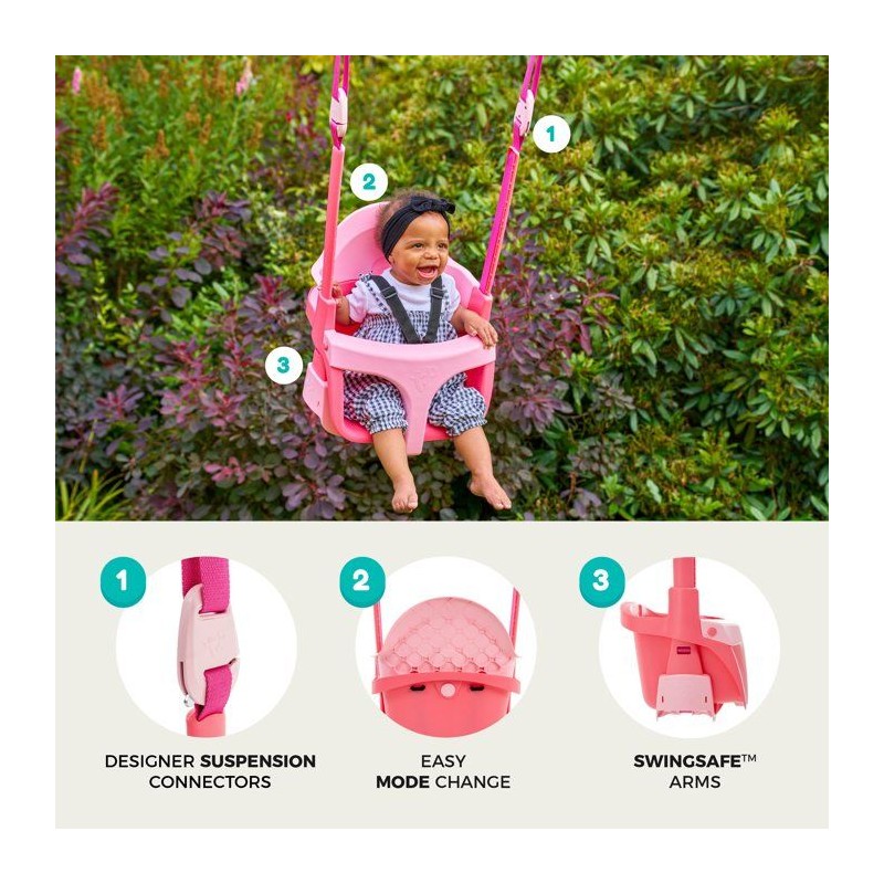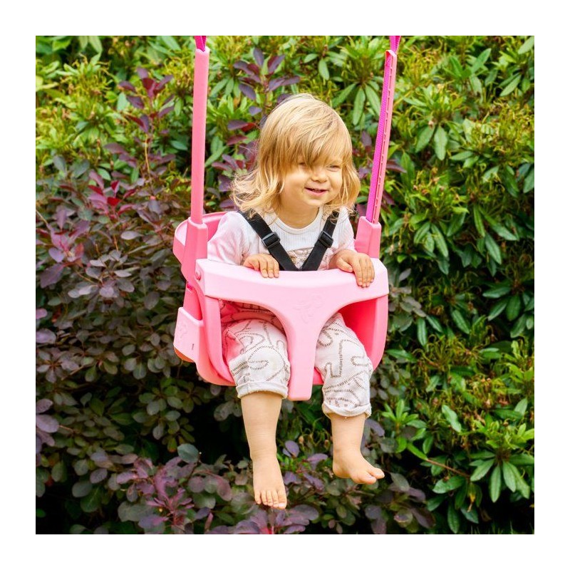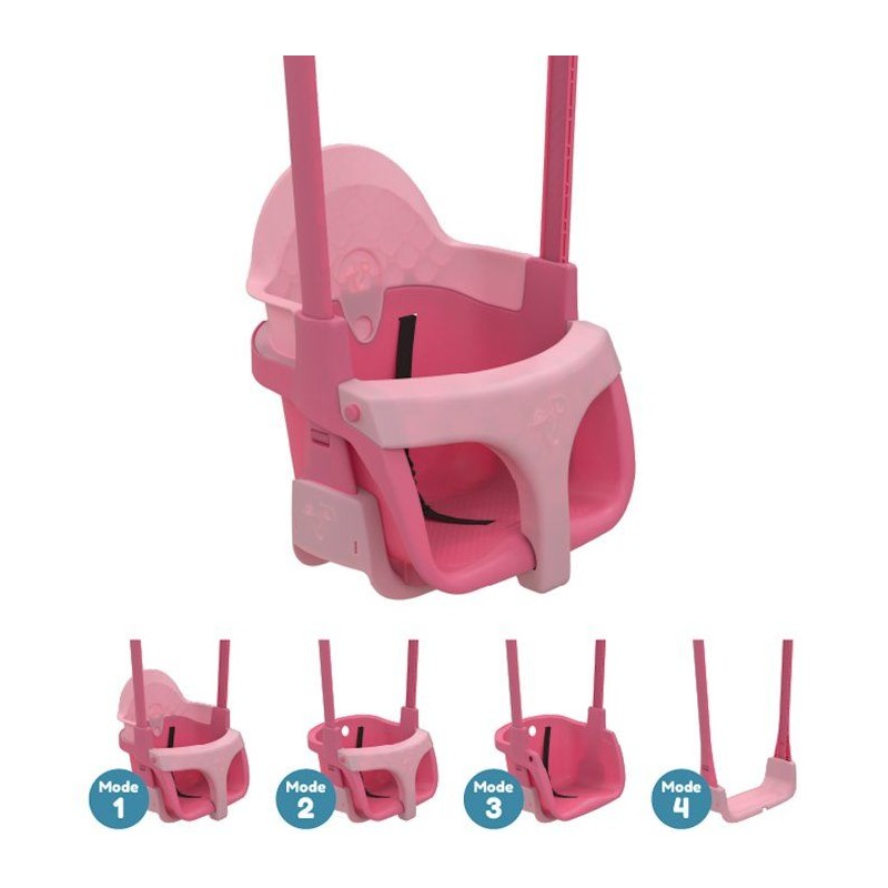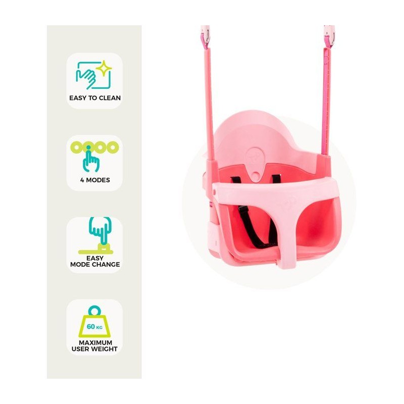 Balançoire pour bébé qui grandit avec l'enfant, 4 modes pour 4 âges : - Mode 1 : une balançoire de style « cocon » offrant un soutien total avec appui-tete moulé, barre en T et harnais. La balançoire est spacieuse et il est facile d'y installer et d'en extraire le bébé (6 mois et plus). - Mode 2 : une fois votre enfant pret, vous pouvez retirer l'appui-tete pour créer une balançoire baquet, toujours parfaitement sécurisé grâce a la barre en T et au harnais (12 mois et plus) - Mode 3 : la barre en T est retirée pour ne garder qu'une balançoire baquet avec harnais qui sécurise parfaitement votre enfant pour une confiance maximale (24 mois et plus). - Mode 4 : une fois votre enfant pret a se balancer en autonomie, retirez simplement l'élément de baquet pour révéler une balançoire traditionnelle de taille généreuse (3 ans et plus).