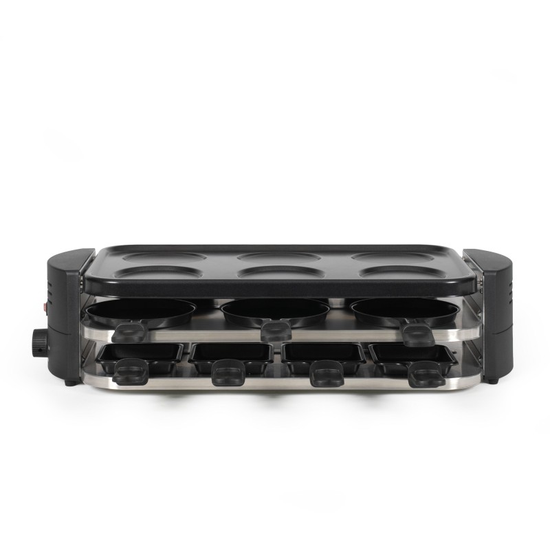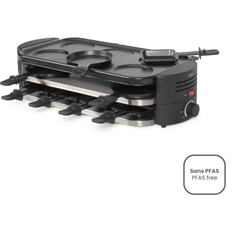 Appareil multifonction qui permet de faire fondre de la raclette, faire cuire des mini pizzas et des mini crepes ou encore de griller des aliments, idéal pour varier les plaisirs en famille ou entre amis tout en satisfaisant les goûts de chacunConçu pour 6 a 8 personnes, parfait pour des repas conviviaux grâce aux 8 caquelons a raclette, 6 caquelons a pizzas et 6 empreintes a crepesPuissance de 1600 W, thermostat ajustable et revetement antiadhésif sans PFAS pour une cuisson saine, rapide et un nettoyage facile