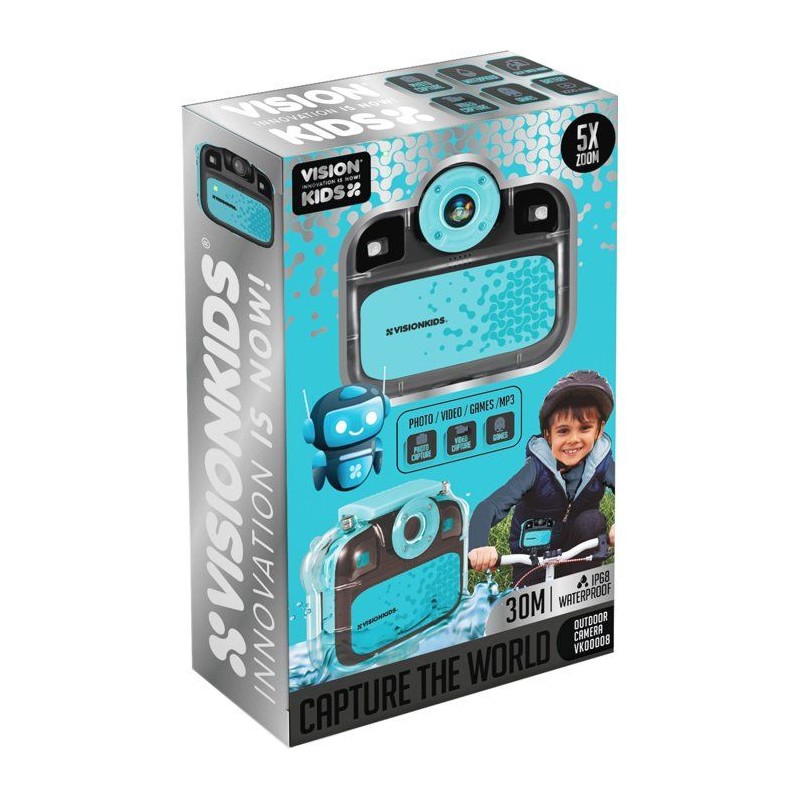 Capture tes meilleurs moments de sport grâce a ta caméra sportive Vision Kids. Recouverte d'une texture rubber, cette caméra tient parfaitement dans les mains. Retrouve de nombreux accessoires tels qu'une boîte étanche pour aller sous l'eau, une fixation vélo et tous les supports. La qualité de l'image sera excellente avec ses 30 millions de pixels. Fonctionne avec batterie rechargeable incluse.