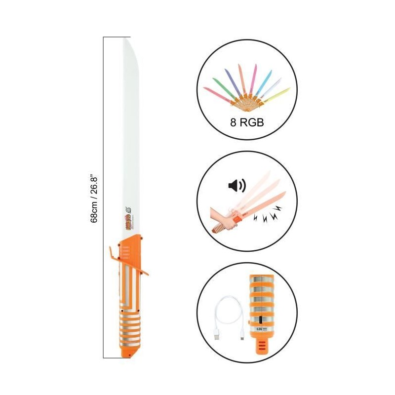 Profitez d'un sabre laser lumineux Naruto qui émet une lueur éclatanteTemps de charge : 90 minutes. Temps de jeu : 60 minutes. Ce sabre est équipé d'effets sonores réalistes a chaque coup porté.Rechargeable via USB-C