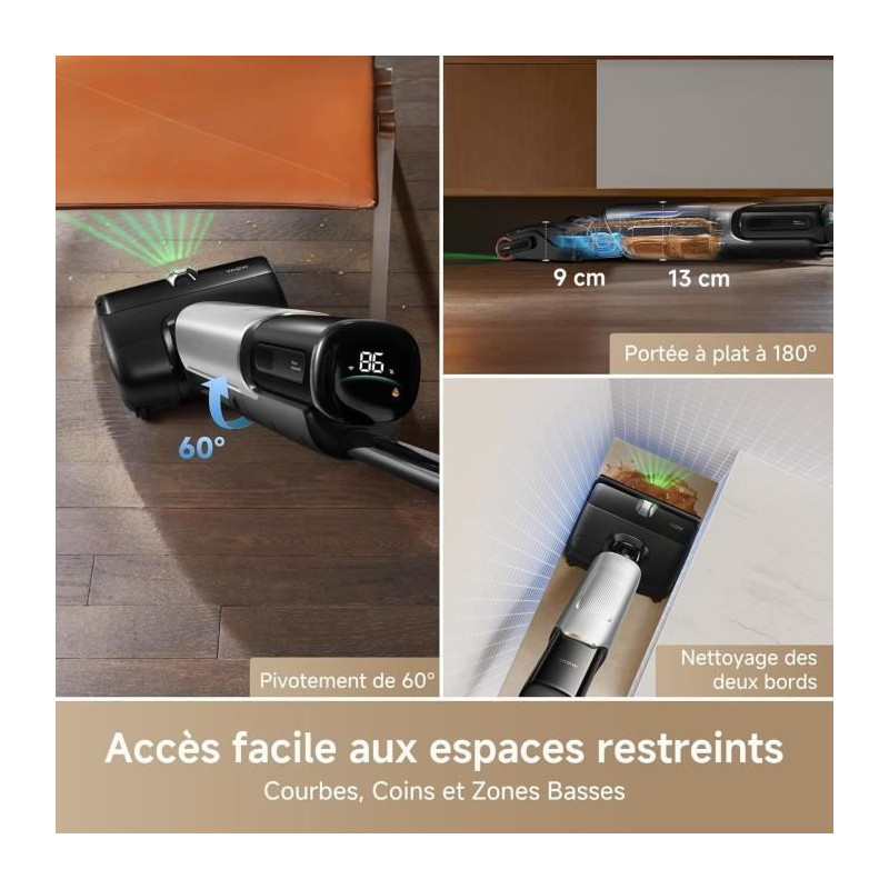 Le MOVA X4 Pro est un aspirateur laveur performant, offrant un lavage a l'eau chaude a 80 °C pour éliminer les taches tenaces. Avec une aspiration puissante de 20 000 Pa et une autonomie de 45 minutes, il atteint facilement les zones difficiles grâce a sa portée a plat a 180°. Son entretien est simplifié avec un auto-nettoyage a 100 °C.