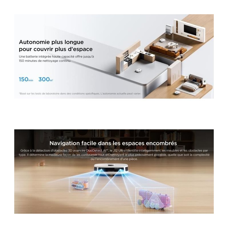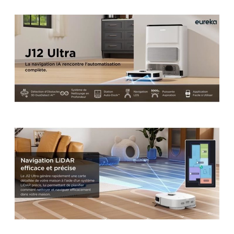 Découvrez l'Eureka J12 Ultra, un robot aspirateur et laveur intelligent qui combine puissance d'aspiration de 5000 Pa et autonomie de 180 minutes. Grâce a sa technologie AI et LiDAR, il navigue avec précision, évitant les obstacles et nettoyant tous types de sols. Sa station 3-en-1 permet un nettoyage mains libres jusqu'a 75 jours, tout en étant contrôlable via l'application ou la voix.
