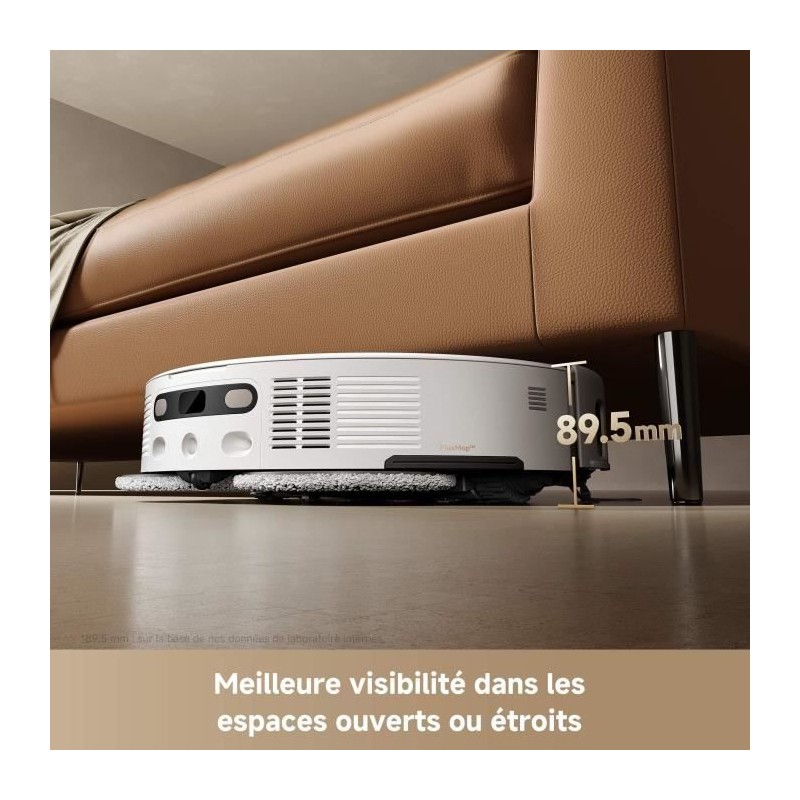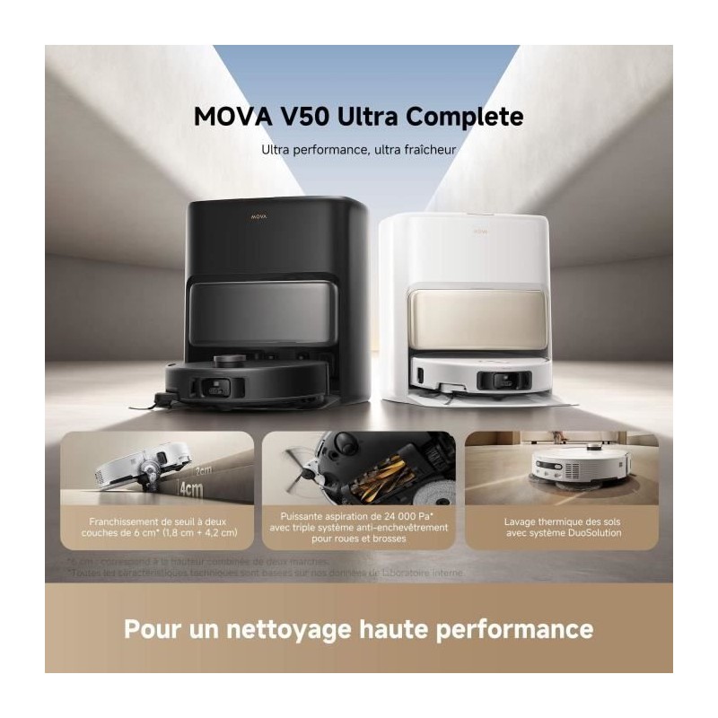 L'aspirateur robot laveur MOVA V50 Ultra Complete offre une puissance d'aspiration de 24 000 Pa pour un nettoyage efficace. Son systeme de lavage thermique DuoSolution et sa navigation FlexiRise garantissent des sols impeccables. Avec vidage automatique, il simplifie votre quotidien.