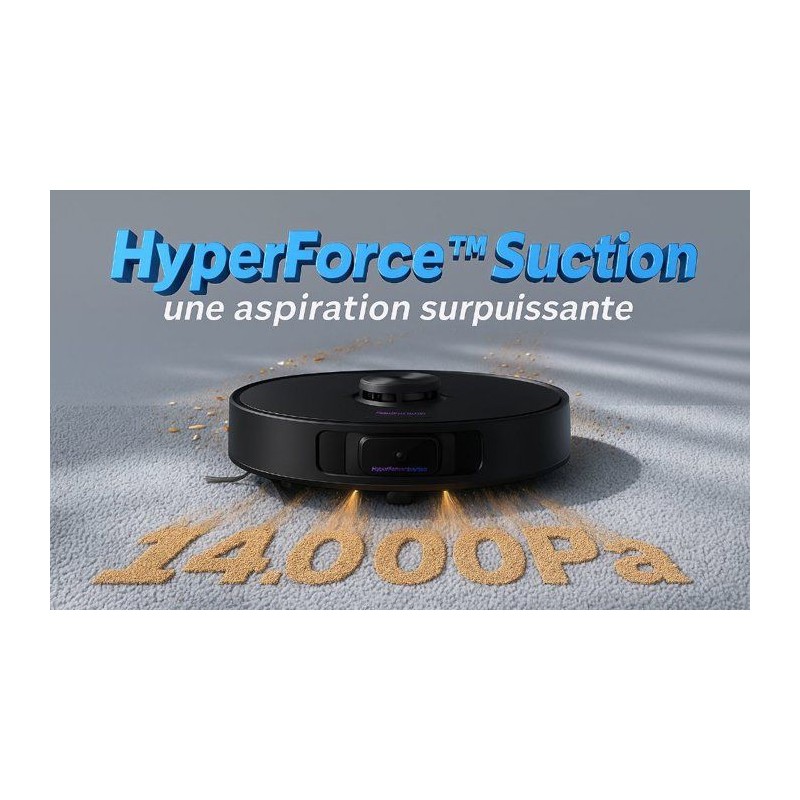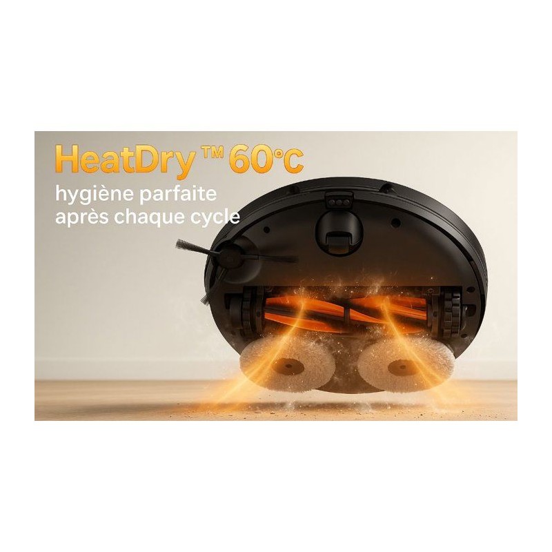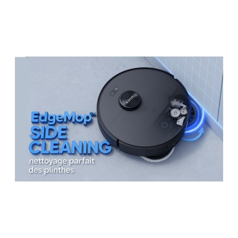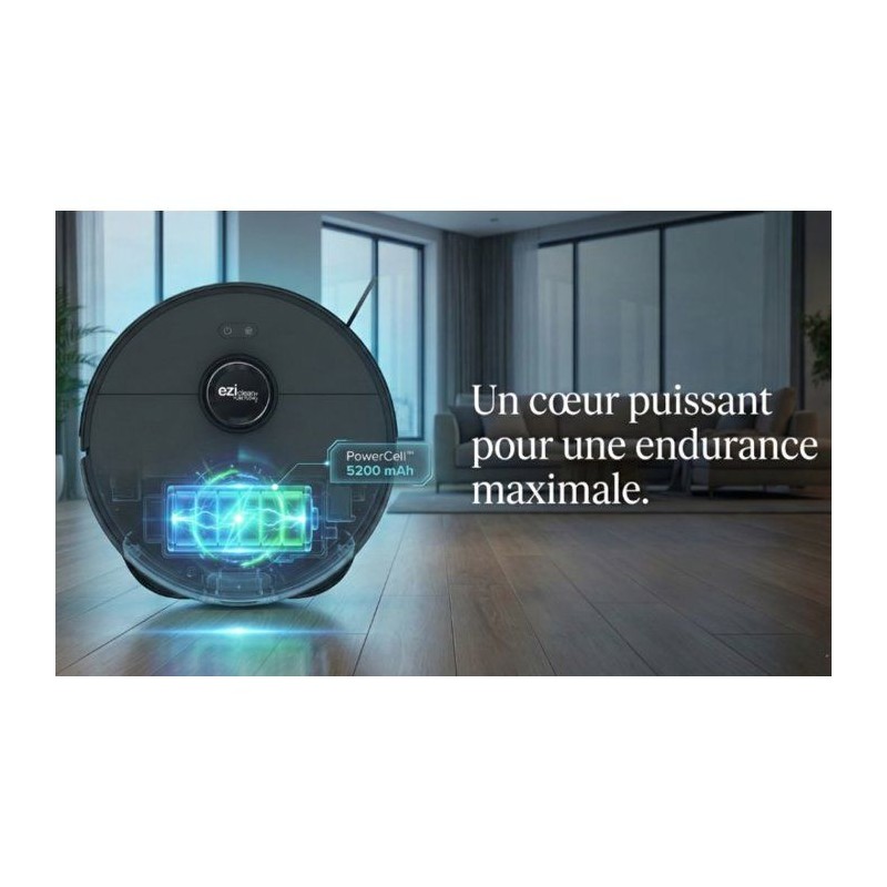 Le robot aspirateur laveur EZICLEAN® PureFlow MAX est conçu pour offrir un nettoyage haut de gamme totalement automatisé. Grâce a son systeme AquaClean(TM) Auto-Refresh, il rince et réhumidifie ses mops toutes les 10 minutes a la station, garantissant un lavage toujours effectué avec de l'eau propre. La mop latérale EdgeMop(TM) assure un nettoyage impeccable le long des murs et plinthes, tandis que la technologie FloorSens(TM) 2.0 détecte instantanément les tapis, augmente la puissance et releve automatiquement les mops pour protéger les fibres. Apres chaque cycle, la station HeatDry(TM) seche les mops a 60°C afin d'éliminer bactéries, humidité et mauvaises odeurs. Son moteur HyperForce 14(TM) délivre 14 000 Pa d'aspiration pour venir a bout des poussieres incrustées, poils d'animaux et saletés tenaces. Doté d'une navigation LiDAR X4 précise et méthodique, il couvre jusqu'a 200 m² par cycle et évite les obstacles avec intelligence. Le DualMopLift(TM) releve les serpillieres jusqu'a 8 mm sur les tapis, et sa brosse TwistFlow(TM) limite les noeuds de cheveux pour réduire l'entretien. Avec son autonomie allant jusqu'a 230 min et son bac a poussiere DustCollector(TM) offrant jusqu'a 45 jours de tranquillité, le PureFlow MAX est un robot pensé pour la performance, l'hygiene et un confort d'utilisation absolu.