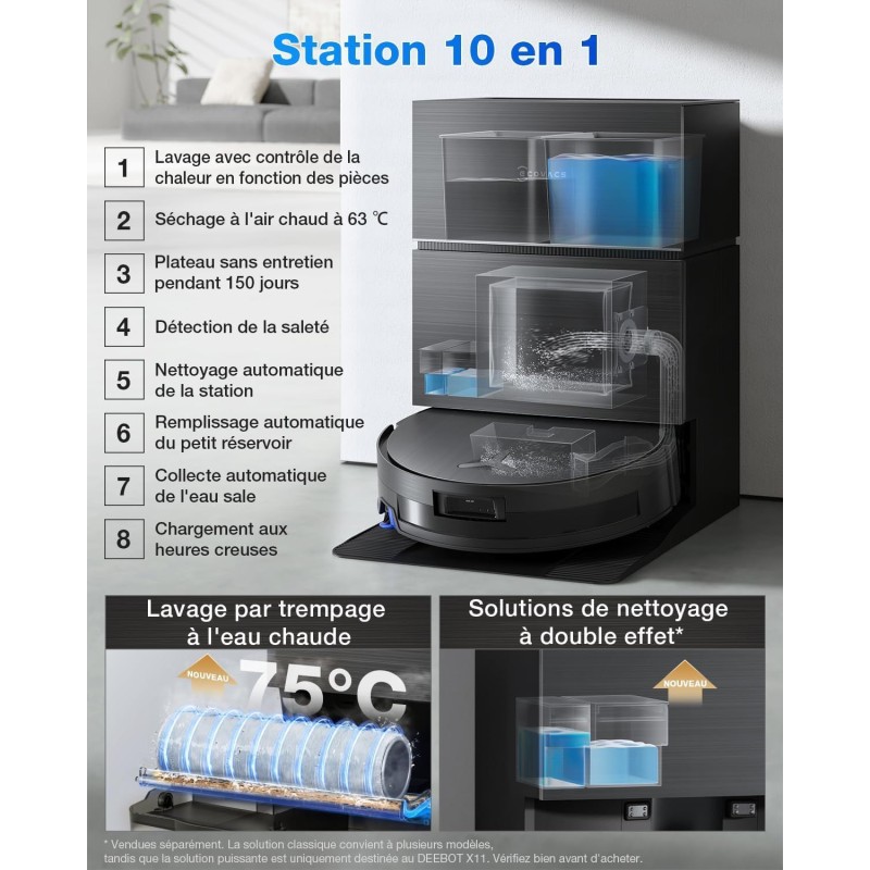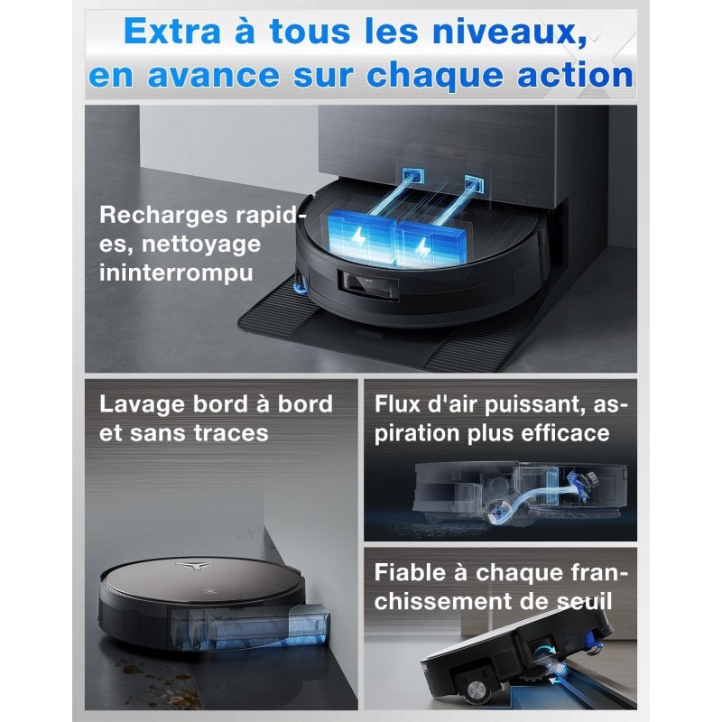 Le DEEBOT X11 PRO OMNI repousse les limites du nettoyage intelligent. Avec sa technologie PowerBoost, il offre une autonomie prolongée jusqu'a 369 minutes et une aspiration extreme de 19 500 Pa. Son systeme OZMO ROLLER 2.0 et TruEdge 3.0 nettoie en profondeur chaque recoin, meme les plinthes, avec une pression et une vitesse impressionnantes. Grâce a l'agent YIKO, il anticipe vos besoins et ajuste automatiquement les parametres pour un nettoyage sur mesure. Sa station OMNI Cyclone assure un lavage a l'eau chaude, un séchage optimal et une gestion complete des déchets. Le X11 PRO OMNI, c'est l'excellence du nettoyage sans effort, pour des sols éclatants jour apres jour.