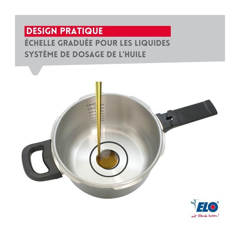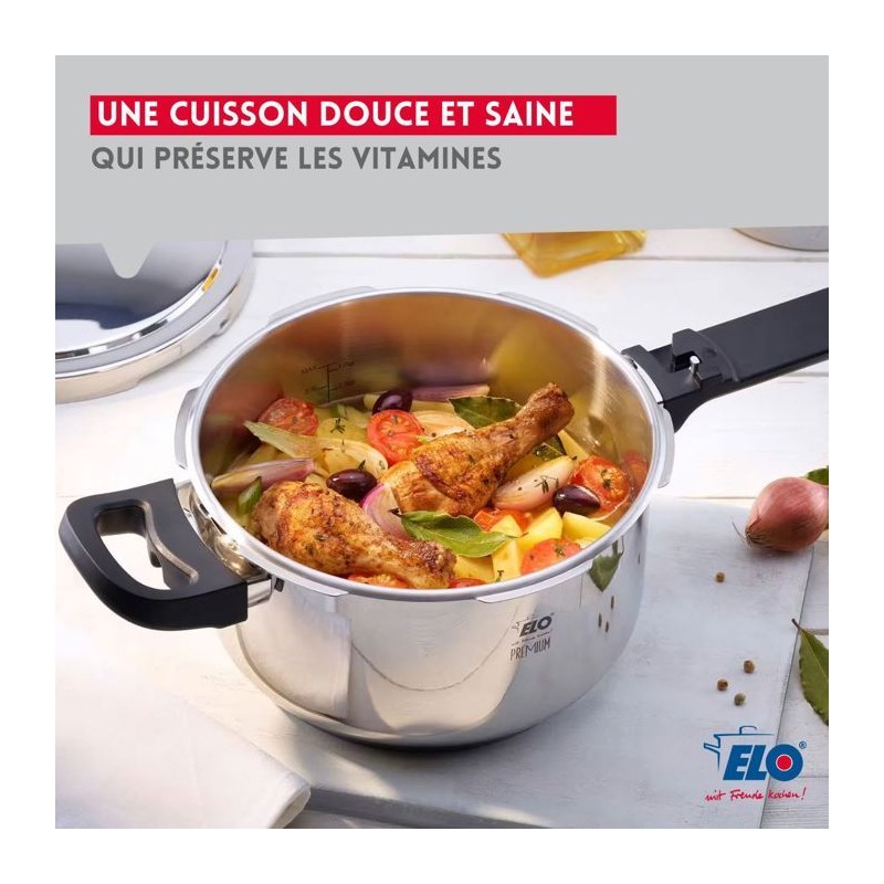 Autocuiseur en acier inoxydable 18/10 Elo Mistral Premium 22 cm, 4,5 L, tous types de feux dont induction, de haute qualité et résistant PETIT + : Il allie cuisine saine préservant vitamines et saveurs, économie de temps et d'énergie jusqu'a 70% par rapport aux cuissons classiques, et facilité d'utilisation avec 2 niveaux de cuisson. COMPOSITION : Acier inoxydable 18/10 de haute qualité pour une cuisson saine design extérieur poli miroir, intérieur finition satinée pratique avec échelle graduée pour les liquides et systeme de dosage de l'huile. DIMENSIONS : Autocuiseur de 22 cm de diametre et 4,5 L de capacité, idéal pour les familles qui ont besoin de plats de bonne qualité nutritionnelle et vite préparés. UTILISATION : Sécure, le Mistral Premium est doté d'une fonction de régulation automatique de la vapeur, d'un dispositif de sécurité qui empeche le couvercle de s'ouvrir si la pression est trop élevée ouverture et fermeture faciles ENTRETIEN : Facile a nettoyer, passe au lave-vaisselle L'autocuiseur Elo Mistral Premium de 22 cm et 4,5 L convient aux familles qui recherchent une cuisson rapide, saine et savoureuse. En acier inox 18/10 synonyme de qualité et de longévité. Il réalise des économies d'énergie et de temps de cuisson (jusque 70% par rapport aux modes de cuisson classiques), grâce a son fond épais qui restitue la chaleur. Avec 2 niveaux de cuisson, il permet une cuisson douce a la vapeur avec seulement petite quantité d'eau, qui préserve les vitamines, les minéraux et les arômes. Sécure, l'autocuiseur Elo Mistral est doté d'une fonction de régulation automatique de la vapeur, et d'un dispositif de sécurité qui empeche le couvercle de s'ouvrir si la pression est trop élevée. Intérieur avec échelle graduée pour les liquides et systeme de dosage de l'huile. Ouverture et verrouillage faciles. Passe au lave-vaisselle. Garanti 6 ans.