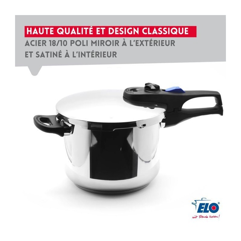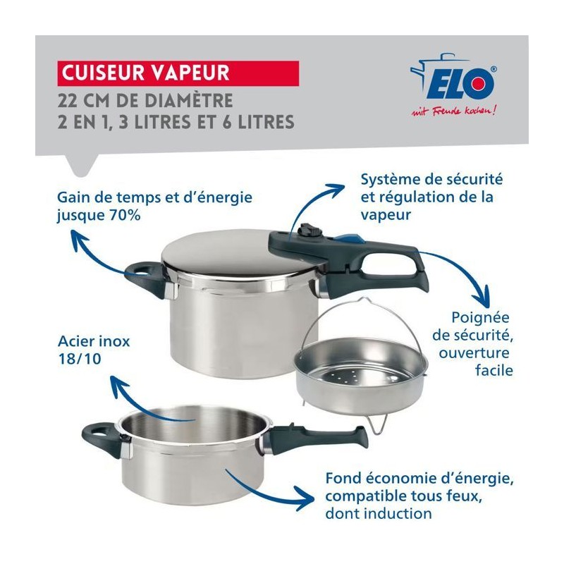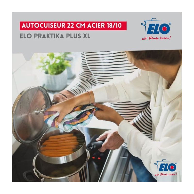 Autocuiseur vapeur ELO Praktika Plus XL 22 cm deux en un, en acier inoxydable 18/10, 3L et 6L, tous types de feux dont induction PETIT + : Économie d'énergie et de temps jusqu'a 70% cuisson a la fois douce et rapide, préservant les arômes les vitamines et nutriments des légumes, des viandes et poissons. COMPOSITION : Acier inoxydable 18/10 de haute qualité, pour une cuisson saine design raffiné avec intérieur satiné et extérieur poli a haute brillance. DIMENSIONS : 2 en 1, ce set est composé de 2 pots de taille différente, d'un couvercle et d'un panier avec support, pour s'adapter a de multiples situations. UTILISATION : Idéal pour cuisiner a la vapeur en toute sécurité grâce a son systeme de régulation de la pression innovant ENTRETIEN : Facile a nettoyer, compatible avec le lave-vaisselle Le set cuit vapeur 2 en 1 ELO Praktika Plus XL est la solution parfaite pour les amateurs de cuisine soucieux de leur santé. Ce set autocuiseur, conçu en acier inoxydable 18/10, allie une esthétique raffinée a une technologie de pointe. Il s'adapte a tous les feux, dont l'induction, mais aussi a de multiples situations. Composé d'un pot de 3L et d'un pot de 6L, d'un couvercle et d'un panier avec support, il se prete a la taille de votre table, et accueillera vos préparations pour 3 a 8 personnes.   Sa capacité a cuire a la vapeur avec une tres petite quantité d'eau garantit que les vitamines, minéraux et arômes de vos aliments sont parfaitement préservés. Grâce a sa base innovante, la chaleur est distribuée uniformément, permettant ainsi une cuisson rapide et économe en énergie. Avec son mécanisme de sécurité de régulation automatique de la pression, vous pouvez cuisiner en toute tranquillité. Sa finition élégante et sa compatibilité lave-vaisselle font de ce produit un atout incontournable pour votre cuisine. Garantie 4 ans, ELO vous assure qualité et longévité.