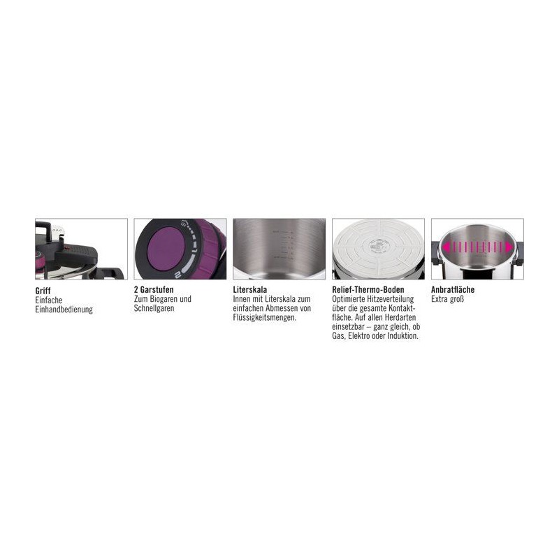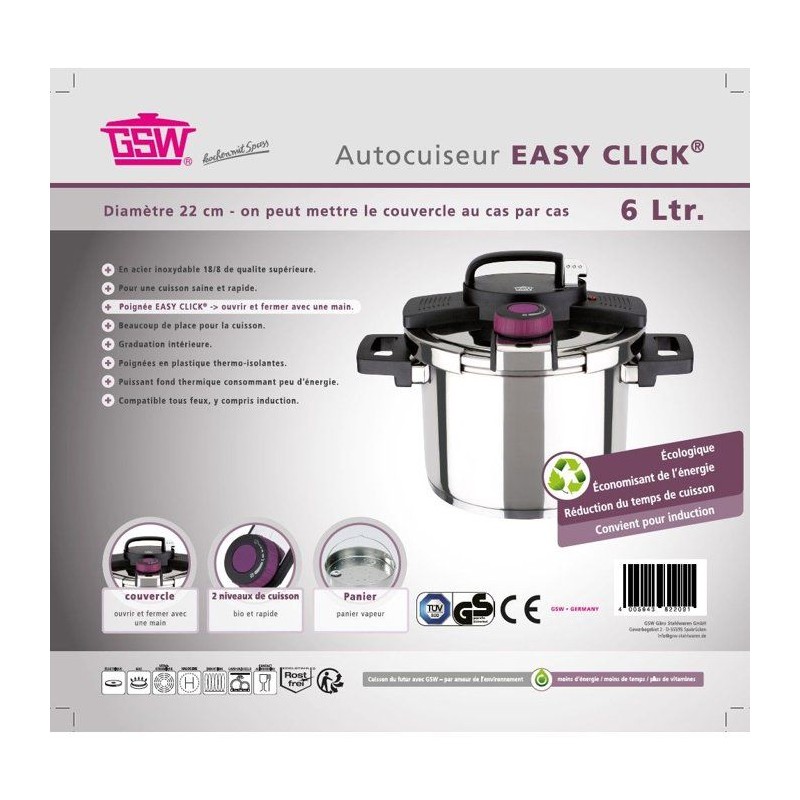 Simplifiez la cuisine du quotidien avec l'autocuiseur GSW Easy Click® 6 L, un indispensable pour préparer des repas savoureux en un temps record. Conçu en acier massif 18/10, il offre une robustesse remarquable et une excellente résistance dans le temps. Grâce a son systeme Easy Click®, l'ouverture d'une seule main devient un jeu d'enfant pour une utilisation plus confortable et sécurisée. Ses graduations internes facilitent le dosage, tandis que sa poignée et contrepoignée isolantes assurent une prise en main fiable. L'intérieur entierement lisse garantit un nettoyage rapide et sans effort. Compatible induction, il est équipé d'un fond ThermoBoden capsulé pour une diffusion homogene de la chaleur et une cuisson économe en énergie. Un allié idéal pour cuisiner sainement, efficacement et avec plaisir.