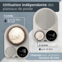Balance double avec 2 plateformes: Les 2 plateformes de pesage séparées enregistrent les quantités les plus petites de 0,1 g a 500 g (petite surface) et de 2 g a 5 kg (grande surface, pas de 1 g) - idéal pour peser avec précision les ingrédients de boulangerie comme la levure.Écran a deux ligne: l'écran LED clair affiche simultanément les poids des deux plateformes en grands chiffres lumineux. Chaque plateforme peut etre utilisée indépendamment de l'autre et dispose de sa propre fonction de tare.Facile a nettoyer: La surface polie en acier inoxydable de la balance de précision ne simplifie pas seulement le nettoyage, elle s'integre aussi élégamment dans chaque esthétique de cuisine. Meme les restes de levain lors de la fabrication du pain sont faciles a enlever.Des fonctions intelligentes: Le temps d'arret extra long de 2 minutes permet de lire les résultats de pesée sans stress. Un total de 6 unités (g, kg, ml, oz, fl:oz, lb:oz), un indicateur d'autonomie des piles et de surcharge rendent cette balance indispensable. 3 Piles AAA incluses.
