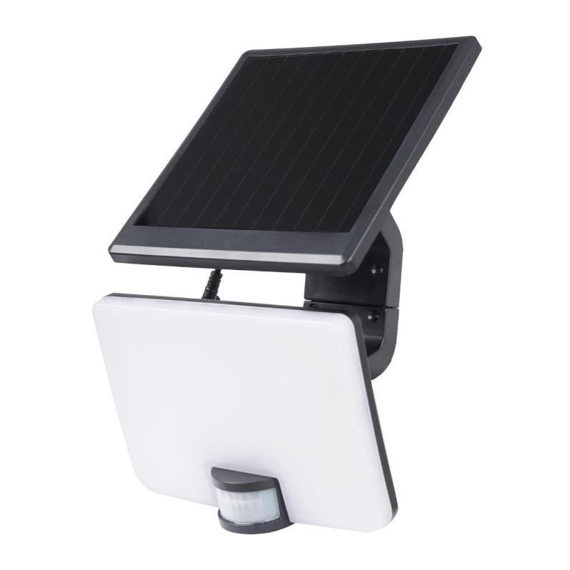 Projecteur LED avec détecteur de mouvement RETLUX RSL 258 - Français Il fonctionne de maniere entierement automatique sans alimentation électrique Deux possibilités de montage : avec le panneau solaire, ou avec le panneau séparément Grâce au panneau solaire amovible, le réflecteur peut également etre placé dans une zone sans soleil - par exemple dans le garage, et le panneau solaire peut etre placé a l'extérieur La possibilité de connexion avec le câble de 2 m fourni Capteur de mouvement PIR Détection de mouvement environ 6 metres, 120 degrés Deux niveaux d'intensité lumineuse 50/100 % (en option) Durée de vie des LED supérieure a 80 000 heures Nombre de LED 98 × SMD 2835 Panneau solaire silicium monocristallin 5 V 1,75 W Type de batterie 18650 3,7 V 3 000 mAh intégrée Consommation électrique 10 W Durée d'éclairage jusqu'a 1 heure a pleine charge (100 % d'intensité) Température de la lumiere 4 000 K Luminosité 1 200 lm Degré de protection IP54 Matériau ABS La longueur du câble de connexion est de 2 m (pour le montage avec le réflecteur, le câble fourni n'est pas utilisé) Dimensions environ 140 x 114 mm (léger), 140 x 79 mm (panneau)