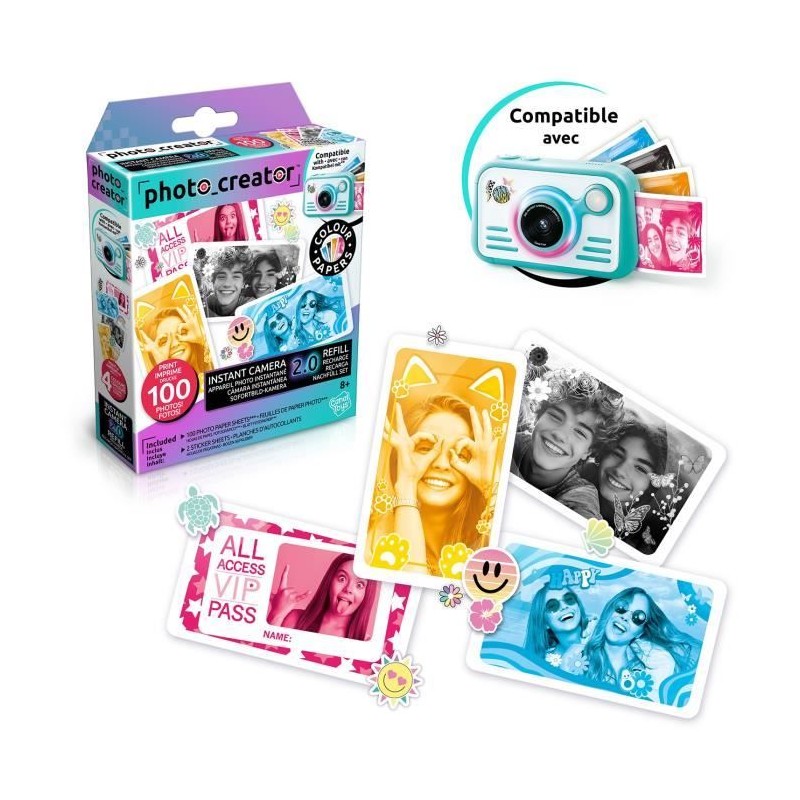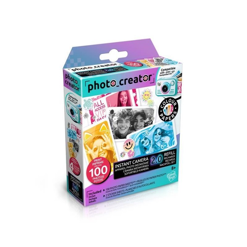 Ce pack de recharge permet d'imprimer des photos en papier photo uniques et originales dans 4 couleurs différentes ! Compatible avec l'Appareil photo instantané 2.0, il permet d'imprimer jusqu'a 100 images en noir, orange, rouge et bleu sur papier photo !