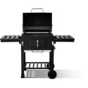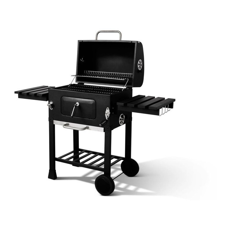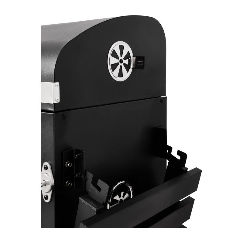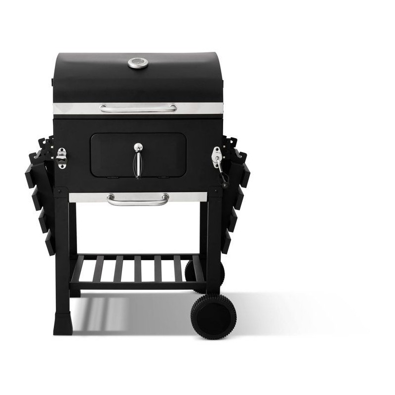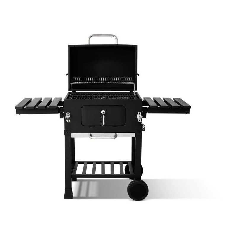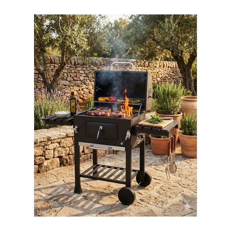 Barbecue a charbon conçu pour une utilisation extérieure, avec structure en acier et finitions inox. Équipé d'un couvercle avec thermometre intégré et d'un systeme de ventilation réglable pour un meilleur contrôle de la cuisson. Dimensions hors tout : 122×50×108,5 cm Surface de cuisson principale : 57,5×37 cm Grille de cuisson en fonte, assurant une montée en température rapide et une restitution homogene de la chaleur. Fonctionnalités : - Deux tablettes latérales rabattables, pour optimiser l'espace de préparation - Décapsuleur en inox intégré - Tiroir a charbon réglable en hauteur pour adapter l'intensité de cuisson - Bac récupérateur de cendres pour un entretien facilité - Deux roues pour un déplacement aisé Modele robuste et fonctionnel, adapté aux grillades traditionnelles en extérieur.