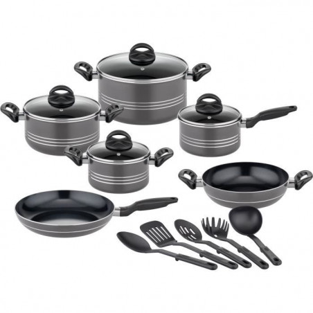 La batterie MILANO GREY de 15 pieces en aluminium massif vous accompagne au quotidien avec style et efficacité. Elle inclut trois marmites (16, 20 et 24 cm), une casserole de 16 cm, deux poeles de 24 et 28 cm, quatre couvercles en verre avec trou vapeur et cinq ustensiles de service. Son revetement antiadhésif VITAFLON QUARZIT sans PFAS permet une cuisson saine et sans accrochage. Grâce a son fond FerroTherm, cette batterie est compatible avec tous les types de feux, y compris l'induction. Finition gris mat élégante.