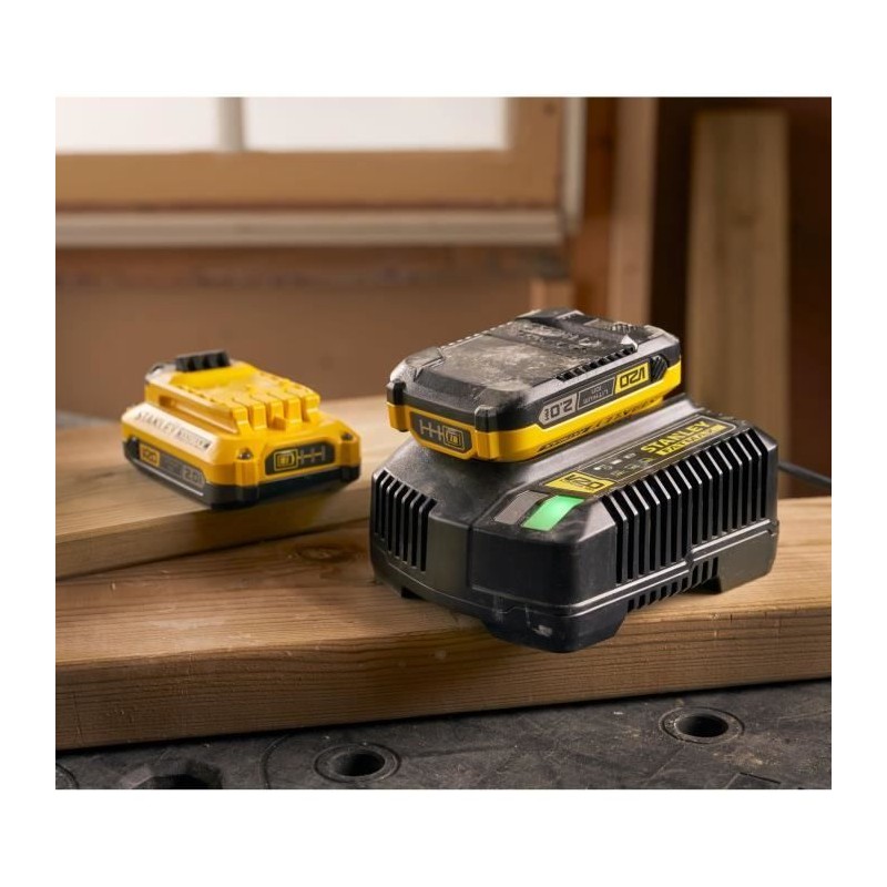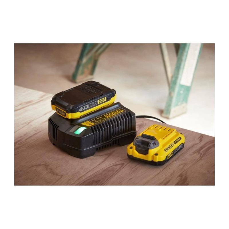 Le kit de démarrage Stanley FATMAX V20 SFMCB12D2-QW est équipé de deux batteries lithium-ion 18V 2Ah et d'un chargeur secteur 18V 2Ah. La gamme V20 offre des performances améliorées par rapport a la génération précédente 18V, grâce a des batteries et des chargeurs plus puissants.