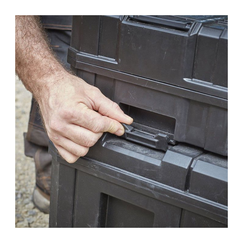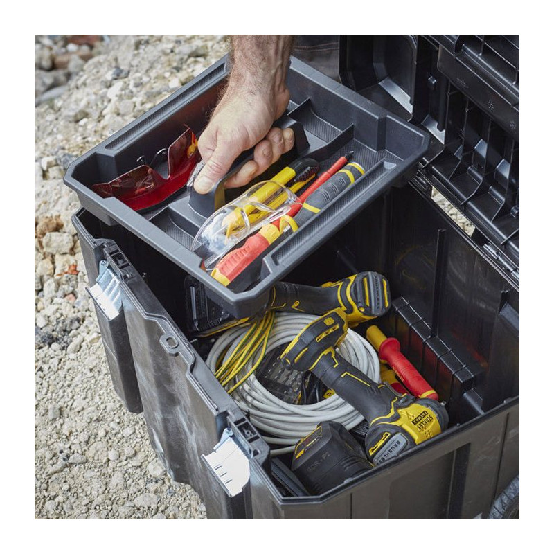 Coffre mobile STANLEY Grand volume avec manche télescopique - FMST1-75753. Poignée bimatiere téléscopique. Roues de 7" résistantes pour assurer une bonne mobilité. Ouverture facile grâce au dessin spécifique de la poignée téléscopique. Mallette grand volume pour vos outils électroportatifs et outillage a main. Modulable et empilable grâce aux clips latéraux. Attaches et charnieres.