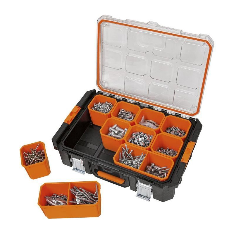 Idéale pour les professionnels, cette mallette organisateur vous permet de ranger efficacement vos petites pieces grâce a ses 12 godets amovibles. Son couvercle transparent offre une visibilité immédiate du contenu et ses fermetures métalliques garantissent une sécurité optimale.