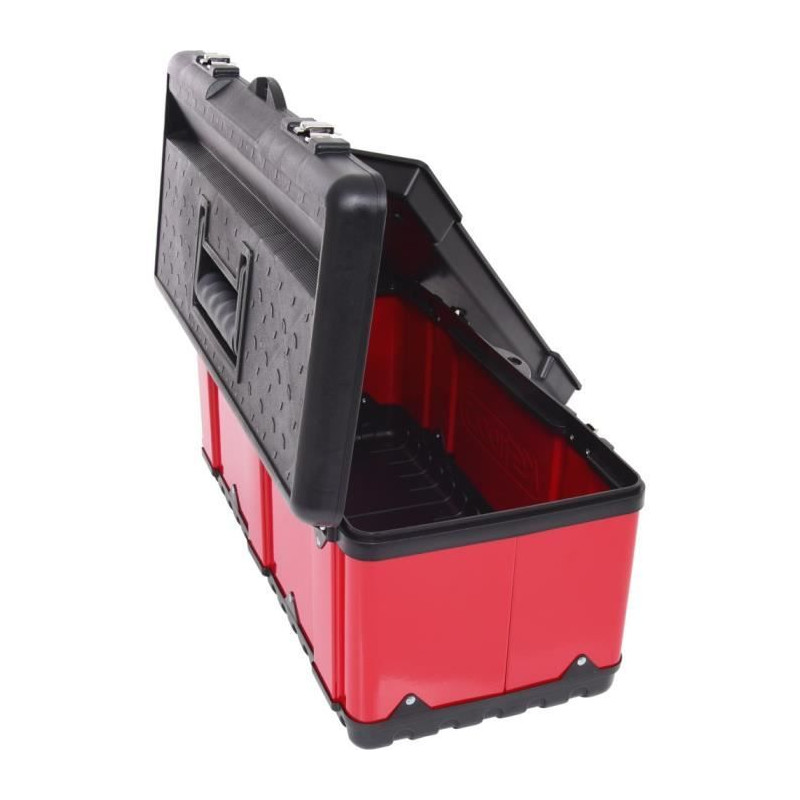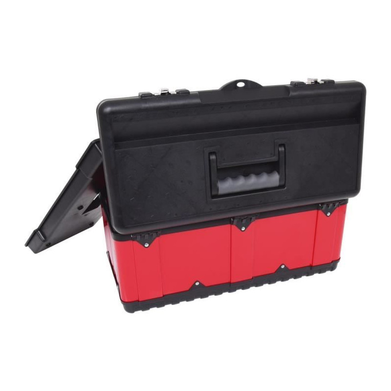 Métal et PVC. Bac a outils amovible. Cadenassable. Charge maximale : 30 kg. Couvercle anti-dérapant. Fermeture métallique. Grand compartiment de rangement. Dimensions intérieures : L.540 x P.230 x H.190 mm.