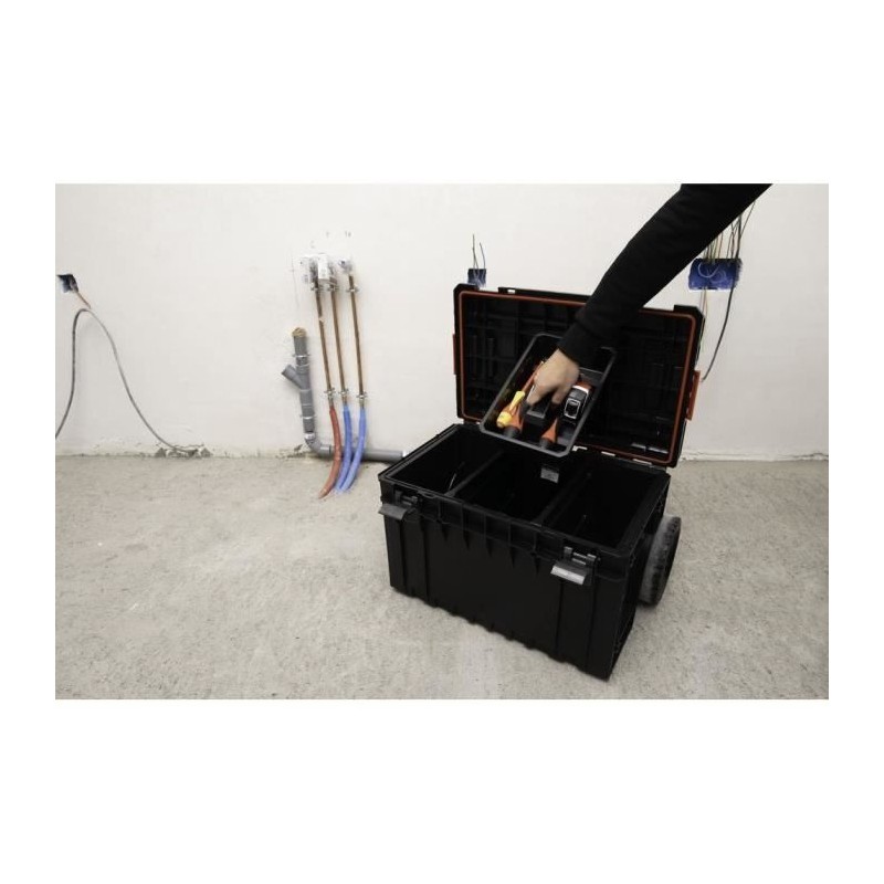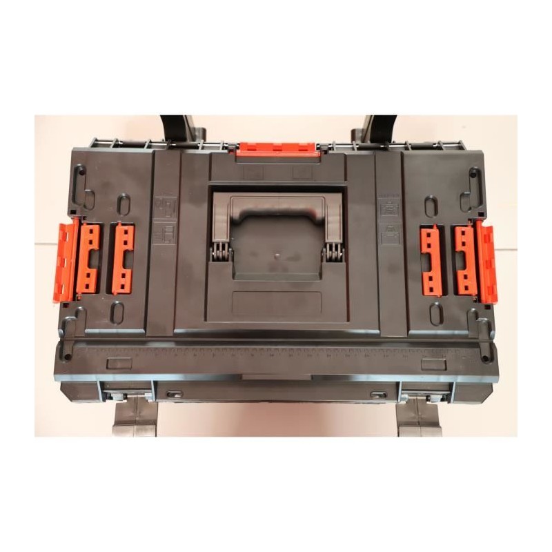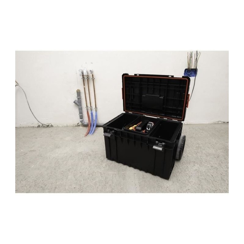 Résiste a une charge de 120 kg sur couvercle fermé, protection contre l'eau et la poussiere grâce aux joints d'étanchéité sous le couvercle, rainure en ''V'' avec regle sur le couvercle pour la coupe d'appoint, poignée de transport, nombreuses possibilités de rangement, matiere plastique.
