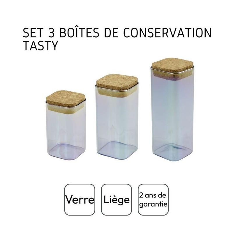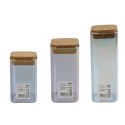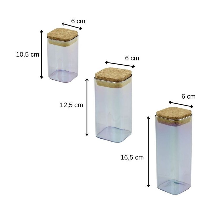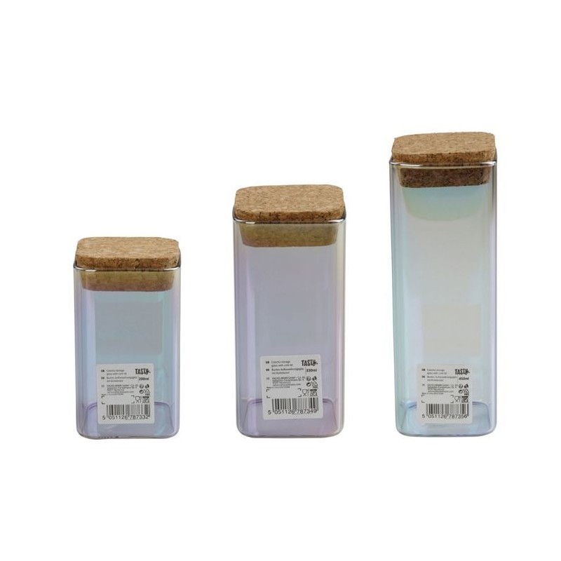 Set de 3 boîtes de conservation en verre avec couvercle en liege, 3 contenances différentes pour s'adapter au mieux a vos placards. LE PETIT + : Ces boîtes alimentaires sont parfaites pour consommer moins d'emballages et acheter sa nourriture en vrac. COMPOSITION et ENTRETIEN : Verre, Liege | Ne convient pas au lave-vaisselle. DIMENSIONS : 280 ml : 10,5 x 6 cm | 330 ml : 12,5 x 6 cm | 450 ml : 16,5 x 6 cm CONTENU : 1 boîte 280 ml + 1 boîte 330 ml + 1 boîte 450 ml Ce lot comprend trois boîtes de conservation en verre avec un bouchon en liege afin de préserver la fraîcheur des aliments. Ces boîtes sont de dimensions différentes pour vous permettre de stocker du sucre, du cacao, des cacahuetes, des sucettes, des amandes, etc. Chacune de ces boîtes alimentaires possede un joli effet holographique donnant un coup de peps a votre cuisine !
