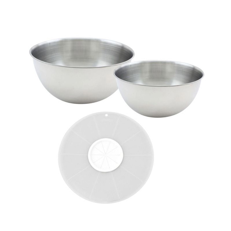 Fackelmann vous propose cet ensemble de 3 ustensiles de pâtisserie composé de 2 bols de préparation en inox et d'un couvercle anti éclaboussures afin de préparer en toute tranquillité gâteaux, pâtisseries et autres mets. LE PETIT + : Les deux bols de préparation ont des diametres différents et peuvent etre employés pour la pâtisserie mais également pour la cuisine afin de réaliser des vinaigrettes, présenter des frites chaudes, concocter des salades composées. COMPOSITION : Les deux bols a mixer sont fabriqués en acier inoxydable, le couvercle anti projections est fabriqué en plastique. DIMENSIONS : Le couvercle anti éclaboussures mesure 30 cm de diametre, il sera compatible avec d'autres récipients de cette dimension, les bols a mixer mesurent 20,5 cm et 25 cm de diametres. UTILISATION : Cet ensemble d'ustensiles de pâtisserie est polyvalent et utilisable également pour la cuisine, les pique-niques, les apéritifs ou d'autres occasions, ils se nettoient facilement a la main Fackelmann France est une entreprise spécialisée dans la distribution d'ustensiles de cuisine et de pâtisserie ainsi que de moules a gâteaux et de plaques de cuisson. L'entreprise tente d'apporter une certaine facilité dans la façon de cuisiner de chacun grâce a ses ustensiles malins. Les ustensiles de cuisine de Fackelmann France sont proposés a tous les profils de cuisiniers pour une utilisation simple et quotidienne. Les fouets, spatules, louches, éplucheurs, planches a découper et bien d'autres sont a votre portée afin de préparer de délicieuses recettes toujours plus originales.