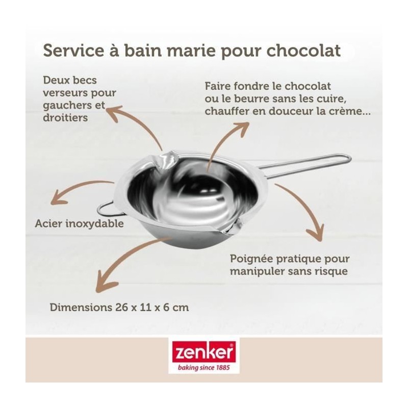 Kit de cuisine composé d'un bain-marie pour chocolat et d'une pince a friture, idéal pour préparer gâteaux, beignets et autres gourmandises. LE PETIT + : Le bain-marie fond le chocolat en douceur pour une texture lisse, la pince a friture permet de manipuler vos aliments sans risque de brûlure. COMPOSITION : Ensemble en acier inoxydable robuste, facile a nettoyer et durable. DIMENSIONS : Bain-marie 26 cm de longueur, diametre 11 cm pince a friture 28,5 cm de longueur, diametre 10 cm. UTILISATION : Parfait pour fondre le chocolat ou frire beignets et nuggets avec précision, compatible lave-vaisselle pour un entretien simplifié. Ce duo d'ustensiles pratiques facilite la réalisation de nombreuses recettes sucrées et salées. Le bain-marie en inox est conçu pour fondre le chocolat de maniere progressive et homogene, évitant tout risque de surchauffe et garantissant un résultat lisse et brillant. Idéal pour vos glaçages, ganaches ou enrobages. La pince a friture en acier inoxydable complete ce kit. Grâce a sa longueur et a sa conception ergonomique, elle permet de manipuler les aliments frits en toute sécurité, sans éclaboussures, tout en assurant une cuisson uniforme et croustillante. Résistant et facile d'entretien, ce lot est un allié indispensable en cuisine comme en pâtisserie. Que vous soyez amateur ou passionné, il vous accompagnera dans la réalisation de recettes gourmandes et réussies.