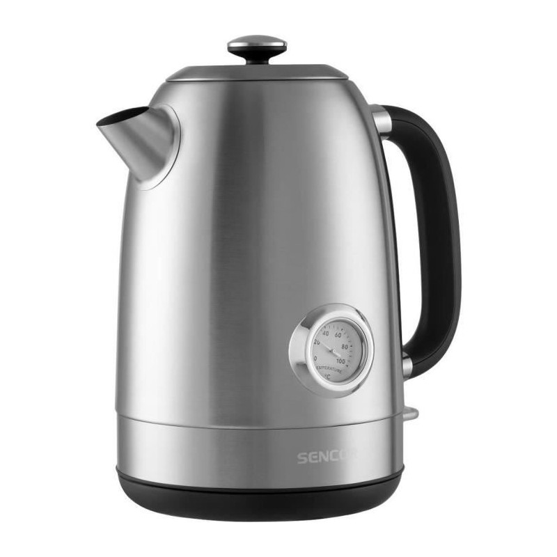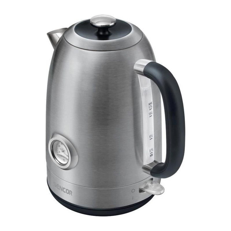Bouilloire éléctrique Sencor SWK 1799SS - Volume 1,7 l Puissance d'entrée : 2 200 W Mesure de la température de l'eau par thermometre. Atteignez la température idéale pour tous les types de thé et autres recettes. Le thermometre sur la face avant indique la température actuelle de l'eau a l'intérieur de la bouilloire électrique. Filtre anti-saleté et anti-calcaire Marque de niveau d'eau Base chauffante en acier inoxydable avec élément dissimulé Bec verseur de forme spéciale empechant les gouttes d'eau indésirables Le couvercle est équipé d'un mécanisme de verrouillage de sécurité pour une sécurité maximale L'acier inoxydable SUS 304 de haute qualité garantit une longue durée de vie Systeme de double sécurité Témoin lumineux de fonctionnement