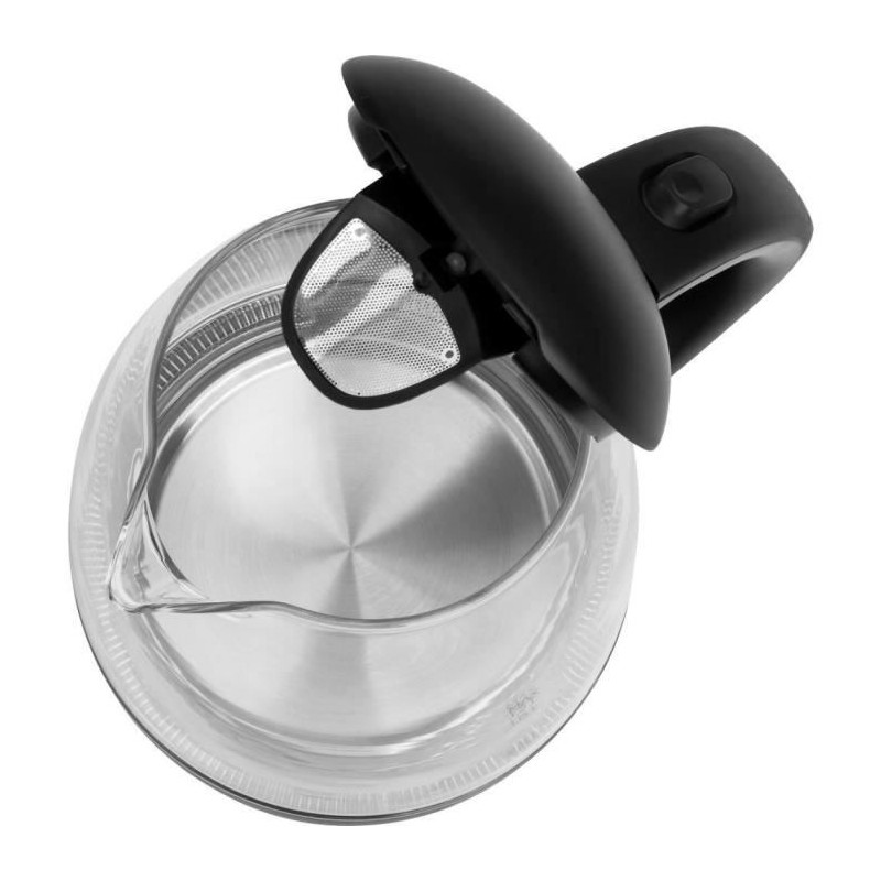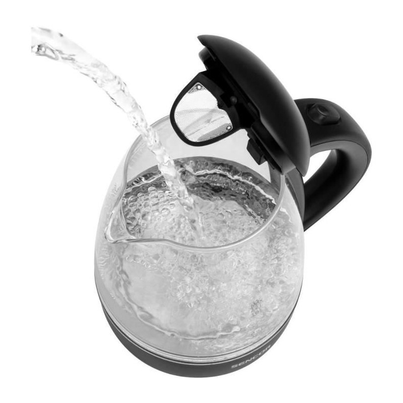 La bouilloire électrique Sencor SWK 2300BK offre une capacité de 1,2 L et une puissance de 2200 W. Son design en verre borosilicaté résiste aux taches de calcaire. Avec un niveau d'eau double face, une base pivotante a 360° et un filtre amovible, elle garantit sécurité et praticité pour chauffer rapidement votre eau.