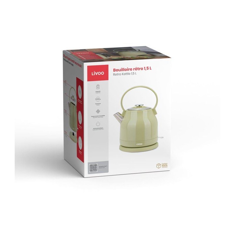 Style rétro et performance avec la bouilloire LIVOO DOD202M. Puissance 2200 W, capacité 1,5 L et corps en acier inoxydable. Base pivotante a 360°, protection contre la surchauffe et arret automatique pour une sécurité maximale. Design vert matcha tendance.
