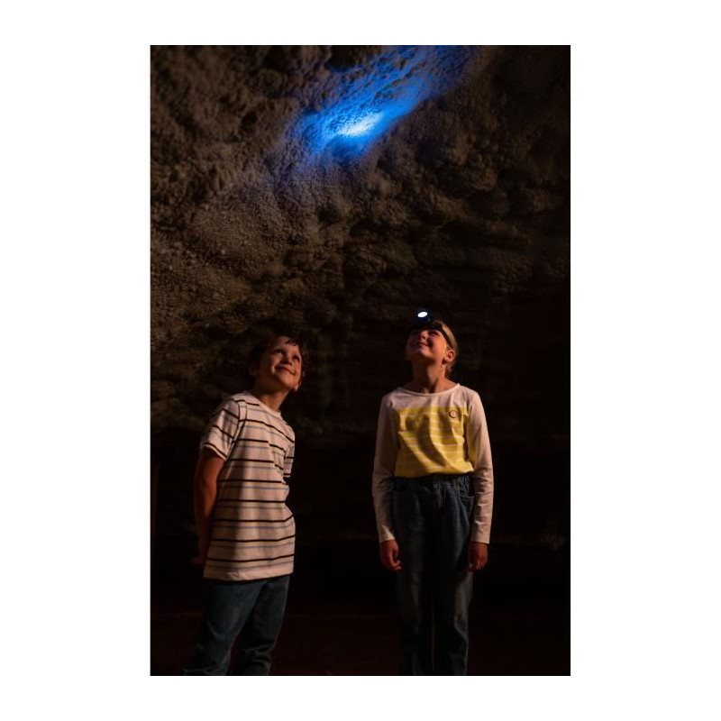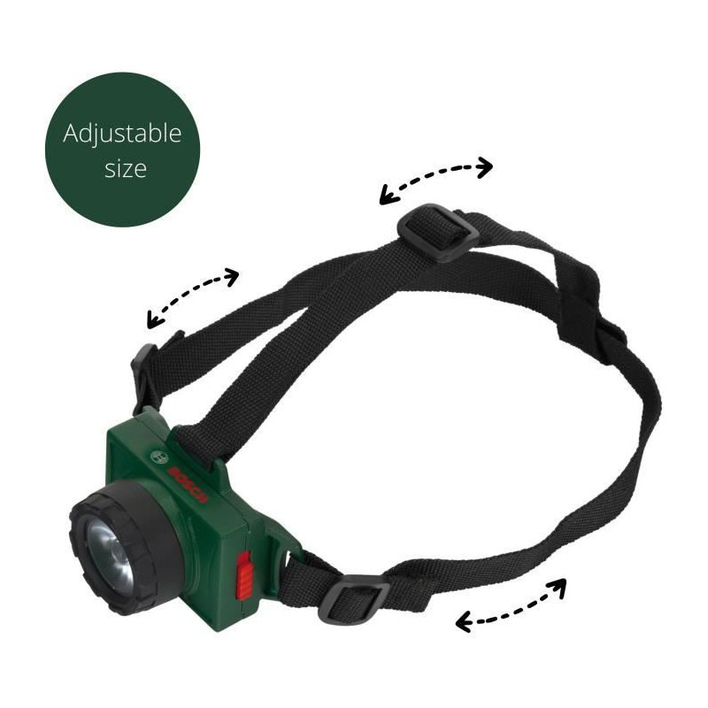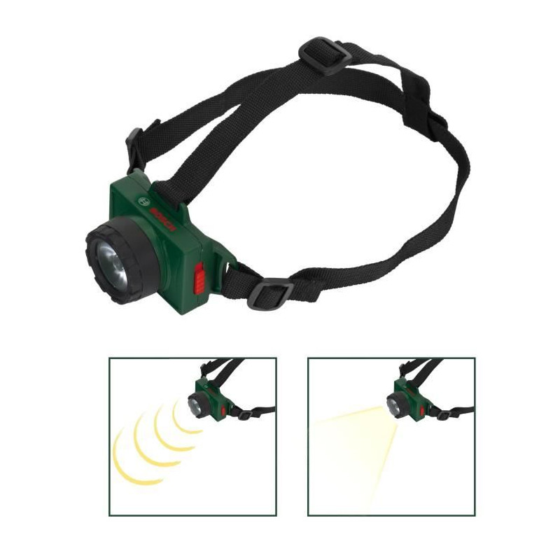 Cette lampe frontale sous licence Bosch permettra aux enfants de bricoler, de lire ou encore de s'aventurer dans les endroits les plus sombres de la maison. Elle est légere, facile a utiliser et agréable a porter grâce a son bandeau ajustable. Elle dispose de deux modes de fonctionnement : lumiere continue ou clignotante. Dimensions hors emballage : 7 x 7 x 2 cm. Piles non fournies : 2 x LR6-AA. A partir de 3 ans.