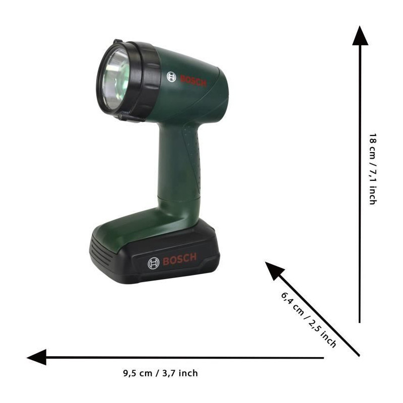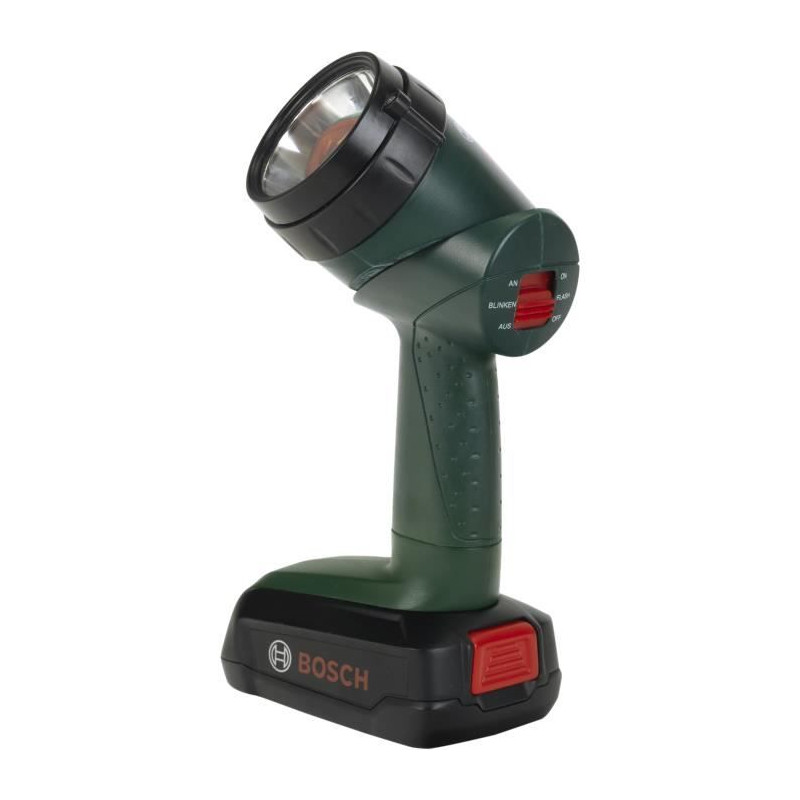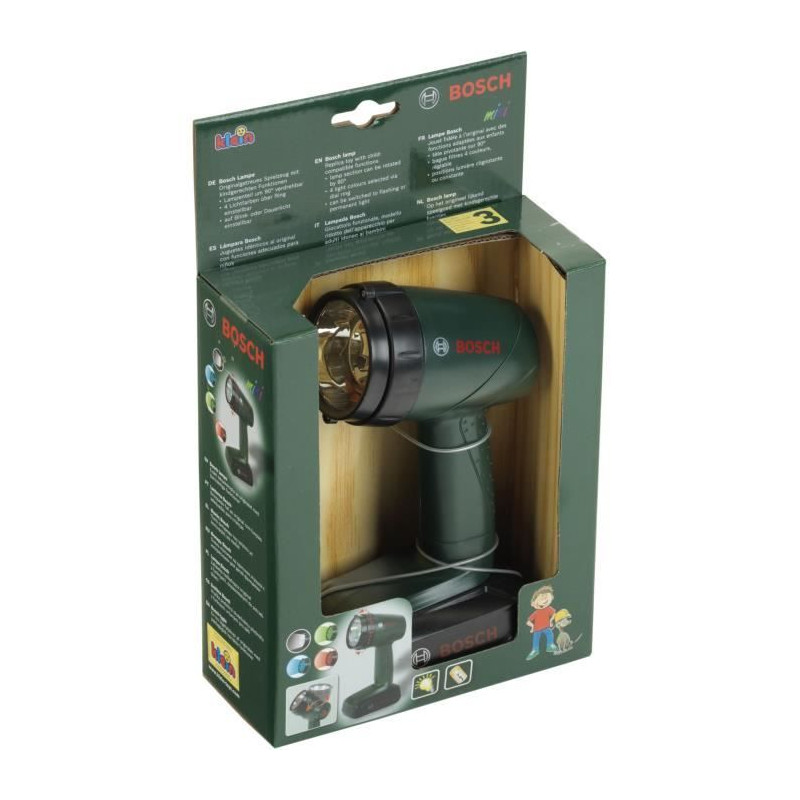 Cette lampe torche sous licence BOSCH est une reproduction tres fidele du modele original utilisé par les adultes. Elle possede une tete qui pivote sur 90° et qui permet d'obtenir un rayon horizontal ou vertical. Elle dispose de 2 modes de fonctionnement : lumiere constante/continue ou lumiere clignotante. En tournant l'anneau noir situé a l'avant de la lampe, la lumiere change de couleur grâce a 4 filtres : rouge, bleu, vert et jaune. Dimensions hors emballage : 9,5 x 6,4 x 18 cm. Piles non fournies : 3 x LR6-AA. A partir de 3 ans.