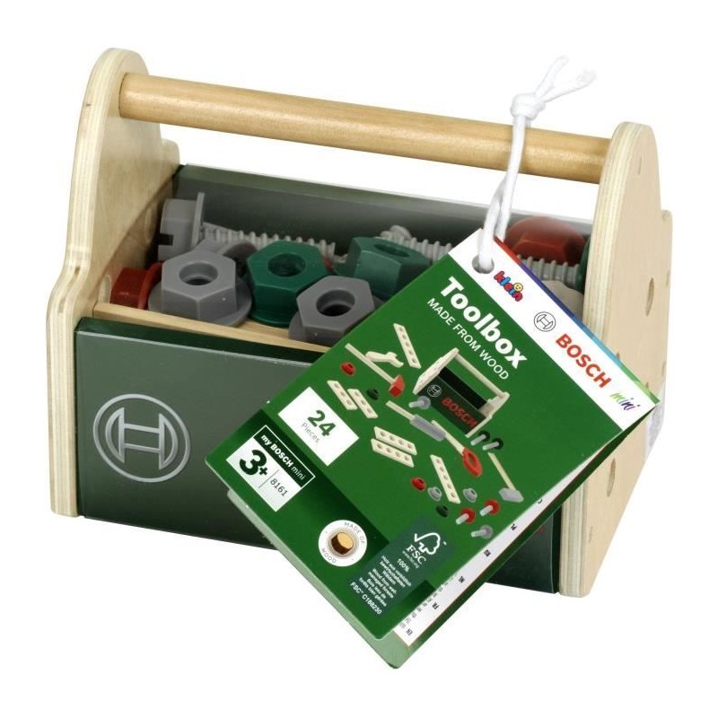 Découvrez la caisse a outils Bosch KLEIN en bois FSC, de qualité supérieure, livrée avec 23 accessoires variés pour des heures de jeu créatif. Dimensions : 18 x 12 x 14,5 cm. Idéale pour les enfants a partir de 3 ans.