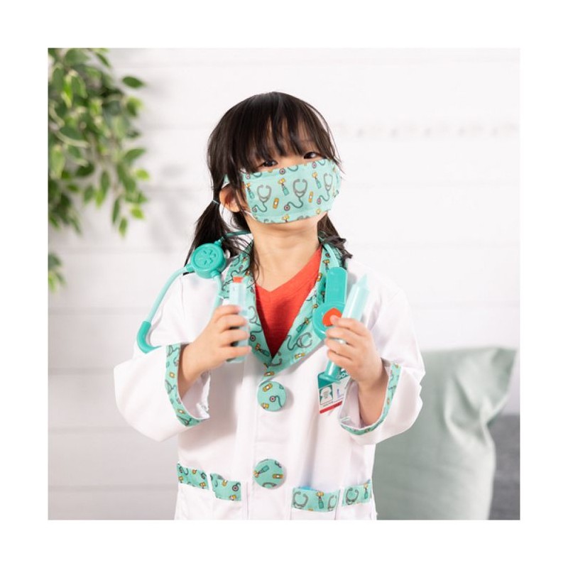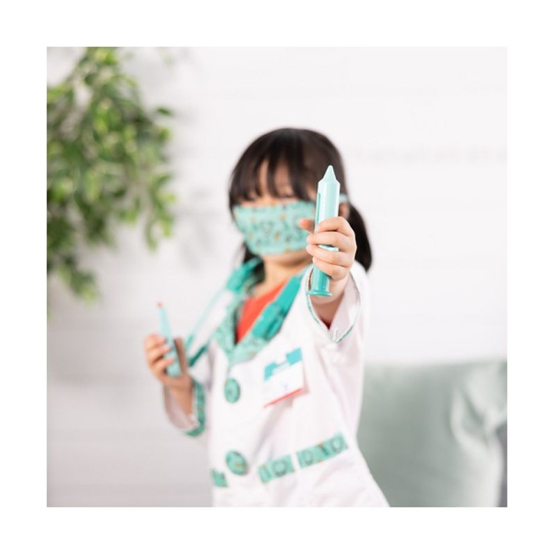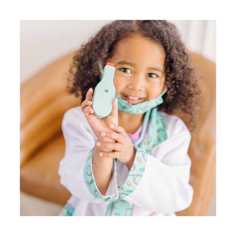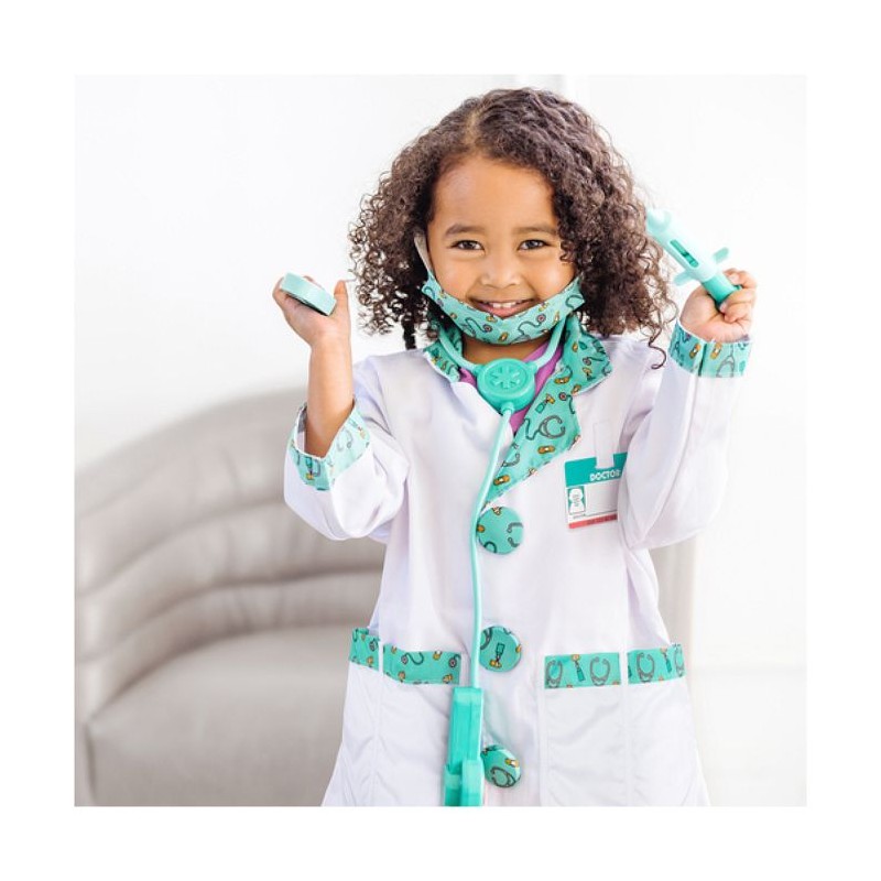 Un coffret d'imitation de docteur Melissa et Doug comprenant un déguisement et de nombreux accessoires. Déguisement réalisé dans des matériaux de qualité pour assurer sécurité et durabilité. Adapté aux enfants de 3 a 6 ans. Il comprend 8 accessoires qui aident les enfants a jouer : une veste, un masque, une seringue, un marteau pour vérifier les réflexes, un otoscope, un stéthoscope fonctionnel et une étiquette pour plus de réalisme. Veste 100% polyester. Lavable en machine. Stéthoscope fonctionnant avec 2 piles LR03 non fournies. Livré sur cintre avec protection plastique. De 3 a 6 ans.