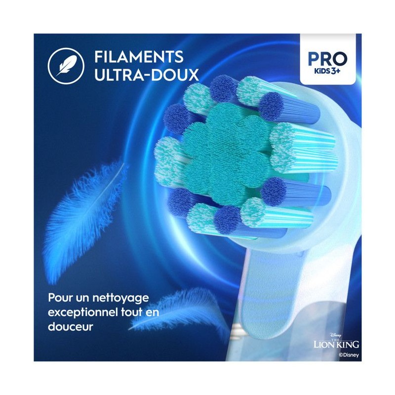La brosse a dents électrique Oral-B Vitality Pro 103 Lion King, recommandée par les dentistes, assure un nettoyage doux et efficace pour les enfants des 3 ans. Avec 2 modes de brossage, elle élimine plus de plaque dentaire qu'une brosse manuelle. Inclus : 1 embout, chargeur et autocollants pour personnaliser.