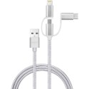 Câble de téléphone 3 en 1. Nouveau câble USB avec 3 connecteurs : - Lightning (Apple). - Micro usb. - USB-C, le nouveau standard (Type C). Câble de 100 cm renforcé et gainé textile argenté. Connecteurs de haute qualité avec sertissage bague aluminium.