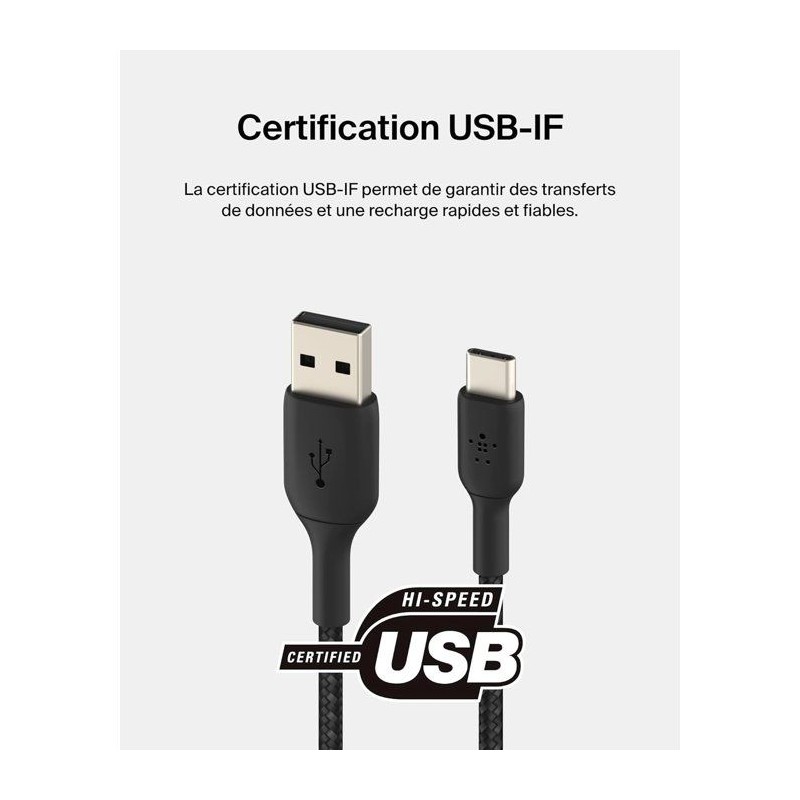 Câble tressé - BELKIN - USB-A vers USB-C - 3 m - Noir