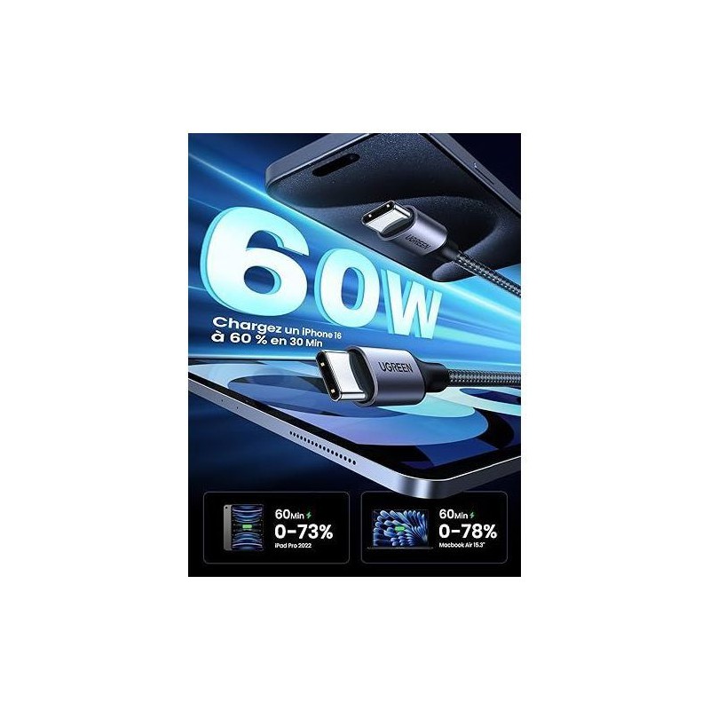 Le câble USB-C UGREEN de 1 metre est conçu pour offrir une recharge rapide jusqu'a 60W et un transfert de données efficace et sécurisé. Son revetement en nylon tressé renforce sa durabilité et protege contre l'usure quotidienne, les torsions et les étirements. Compatible avec tous les appareils USB-C prenant en charge la charge PD, il permet de recharger smartphones, tablettes et ordinateurs portables en toute sécurité. Sa longueur pratique de 1 metre offre un équilibre parfait entre maniabilité et portée, idéal pour le bureau ou les déplacements. Léger, flexible et résistant, ce câble noir sobre allie performance et élégance, faisant de lui un accessoire fiable et durable pour vos besoins quotidiens de recharge et de synchronisation.