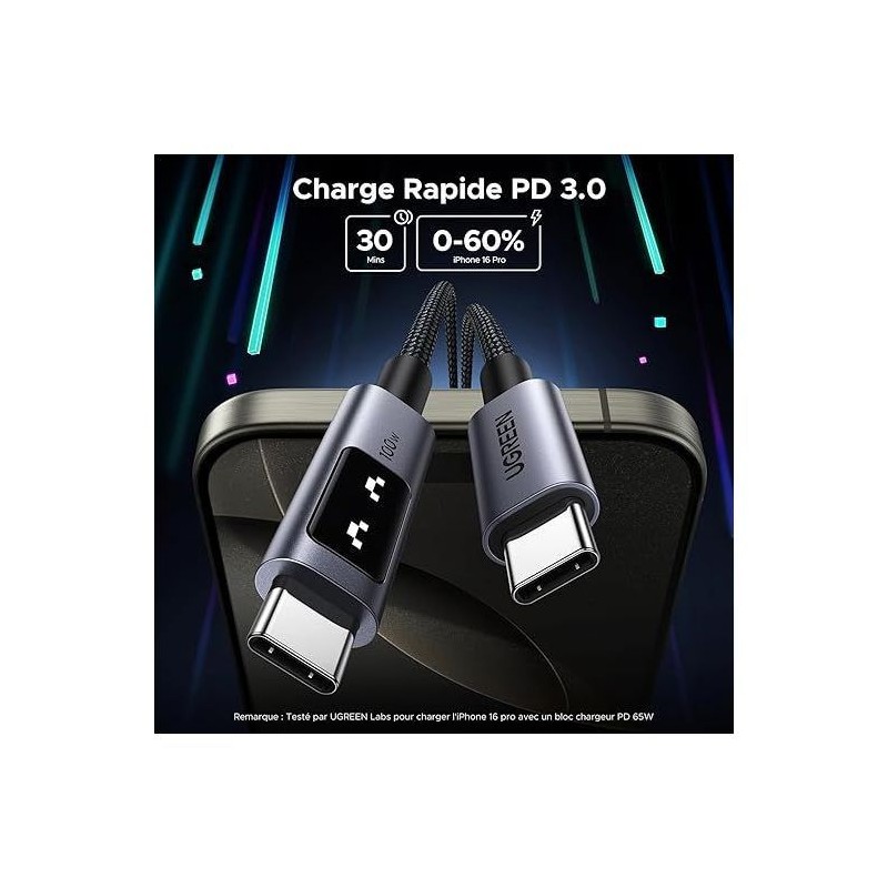 Câble data USB-C vers USB-C - UGREEN - PD 100W - Nylon - 1 m - Noir
