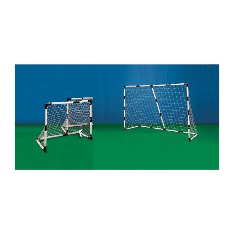 Set de football "2 en 1" composé de deux mini cages en plastique et d'une balle en PVC "écologique" (formule partiellement conçue avec un dérivé d'origine végétale). Set modulable : les 2 mini cages peuvent etre assemblées pour former une cage plus grande. Dimensions des cages (petite taille) : 91,5 x 45 x 63 cm. Dimensions des cages (grande taille) : 183 x 45 x 121 cm. Balle : Ø 14 cm, 60 grammes.