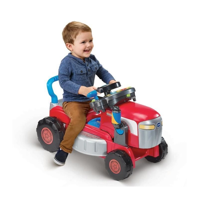 Super tracteur magi'tondeuse - 12 - 36 mois Un tracteur 3 en 1 qui se transforme facilement en une super tondeuse réaliste ! Évolutif, ce tracteur s'adapte a l'enfant et suit son développement grâce a 3 configurations possibles : - Un porteur stable avec tableau de bord interactif. Le programme reconnaît le mode tr