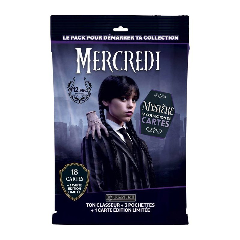 Cette offre est composée de : - 1 classeur - 3 pochettes de 6 cartes, soit un total de 18 cartes*. - 1 Carte Édition Limitée n°1 Plonge dans l'univers étrange et envoûtant de Mercredi - Saison 2 avec cette collection de cartes pleine de mystere, de secrets... et d'ombres venues de Nevermore Academy Pars a la chasse de 216 cartes a collectionner, dont 36 cartes paralleles et 81 cartes spéciales : brillantes, fluorescentes, a encre magique et phosphorescentes... pour faire briller les ténebres, meme dans la nuit Certaines cartes brillantes s'assemblent comme les pieces d'un vitrail magique... 5 cartes Édition limitée sont a retrouver dans les produits suivants : - La carte Édition Limitée n°1 dans le pack de démarrage composé d'un classeur + 3 pochettes + 1 carte Édition Limitée - La carte Édition Limitée n°2 est offerte pour l'achat d'une boîte de 24 pochettes - Les cartes n°3, n°4 et n°5 sont réparties de maniere aléatoire dans le blister de 4 pochettes + 1 carte Édition Limitée * Cartes réparties aléatoirement dans les pochettes.