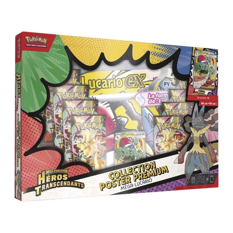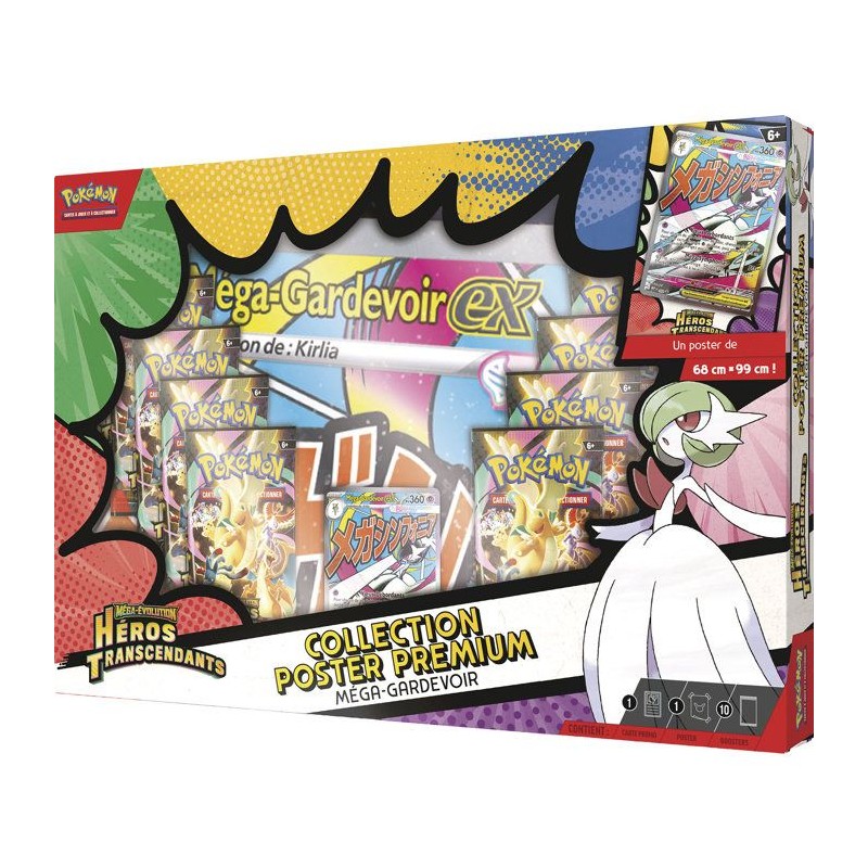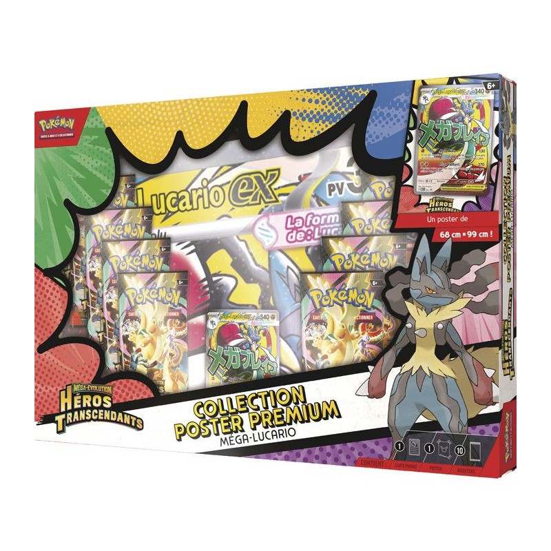 Dotés d'attaques puissantes et de PV élevés, Méga-Gardevoir-ex et Méga-Lucario-ex dépassent les limites au combat. Faites équipe avec l'un de ces puissants Pokémon-ex Méga-Évolution en tant que carte promo brillante entierement illustrée, puis trouvez davantage de Pokémon dans les 10 boosters de l'extension spéciale Méga-Évolution - Héros Transcendants. Vous obtiendrez également un grand poster de Méga-Lucario ou de Méga-Gardevoir et d'autres Pokémon mis en vedette dans cette extension spéciale.
