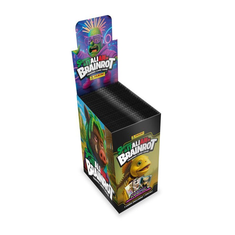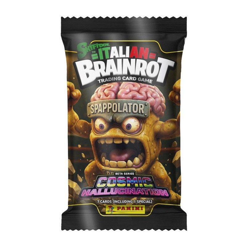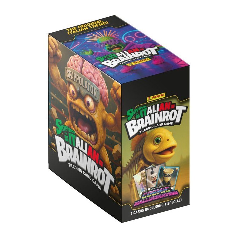 Cette boite est composée de: -24 pochettes de 7 cartes soit un total de 168 cartes* Plongez a nouveau dans l'univers déjanté de Skifidol Italian Brainrot avec la collection Série 2 de cartes TCG venue d'Italie - COSMIC HALLUCINATION , déja adorée par toute une génération ! Cette nouvelle édition pousse l'humour et l'absurde encore plus loin, avec un ton plus « hard » et résolument trash que la premiere. Tres populaire sur TikTok et Instagram, elle mele humour décalé, clins d'oeil a la pop culture et un univers unique qui séduira autant les enfants que les parents nostalgiques. Avec ses 150 cartes a collectionner, dont 50 cartes spéciales, et un album de 32 pages permettant d'ajouter les cartes, Skifidol Brainrot offre un moment de partage fun, surprenant et totalement inédit ! *Cartes réparties aléatoirement dans les pochettes.