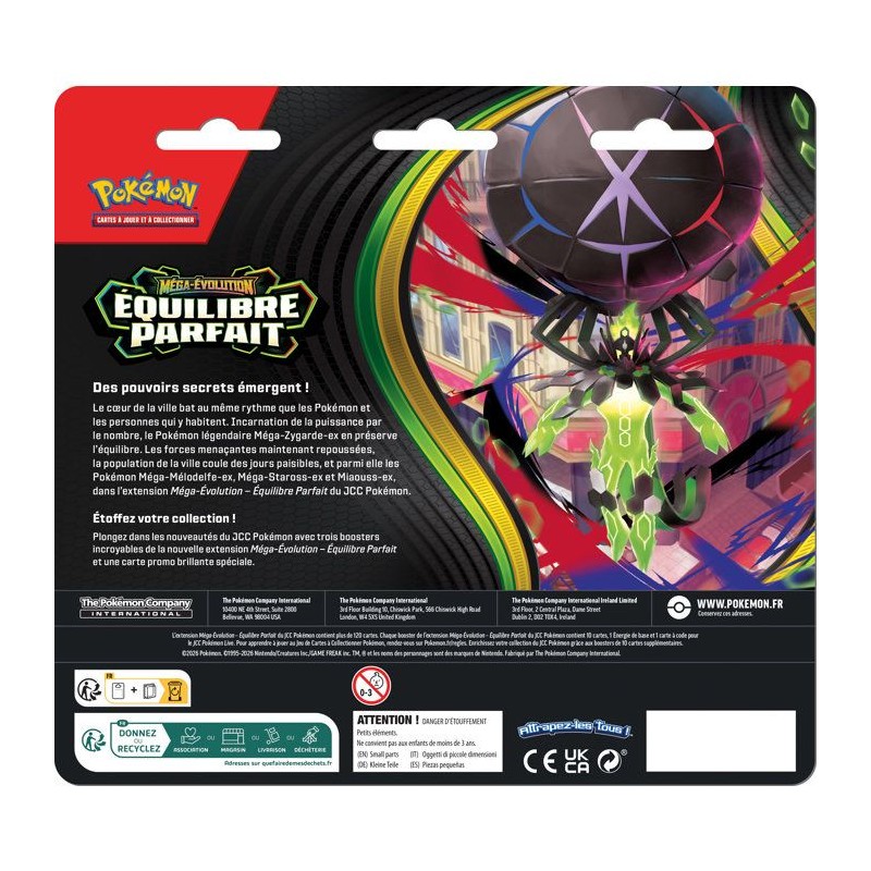 Le coeur de la ville bat au meme rythme que les Pokémon et les personnes qui y habitent. Incarnation de la puissance par le nombre, le Pokémon légendaire Méga-Zygarde-ex en préserve l'équilibre. Les forces menaçantes maintenant repoussées, la population de la ville coule des jours paisibles, et parmi elle les Pokémon Méga-Mélodelfe-ex, Méga-Staross-ex et Miaouss-ex, dans l'extension Méga-Évolution- Équilibre Parfait du JCC Pokémon !